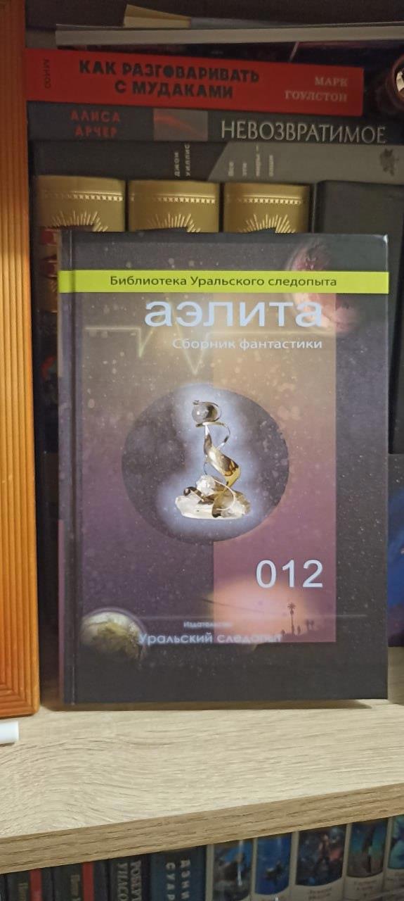 В 2016 году я участвовал в конкурсе «Аэлита» журнала «Уральский следопыт». К тому времени я активно писал уже года два, но в основном коротыши не больше десяти тысяч знаков. Я работал над этим текстом неделю, выгранивал, перепроверял, пока наконец не отправил. Получилась история о человеке, в результате автомобильной аварии получившем кибернетическое тело и почти сразу оказавшемся посреди ядерного апокалипсиса. Моральные дилеммы, выживание, взаимопомощь и всё такое. В итоге рассказ вышел в финал и попал в сборник. Я честно ждал свои авторские экземпляры, но так и не получил. Эх. Не знаю, что там у них случилось, забыли про меня или забили, но достал я его случайно: увидел на Фантлабе, потом нашёл на озоне. Вот так, спустя девять лет я свой экземпляр таки получил. Почти новый, его даже не открывали ни разу за это время. На обложке — это такой рисунок, а не потёртости. Да, очень неудачная картинка) Не удивлюсь, если это именно тот, который мне не отправили))