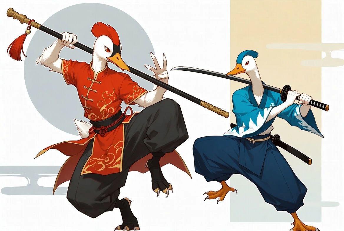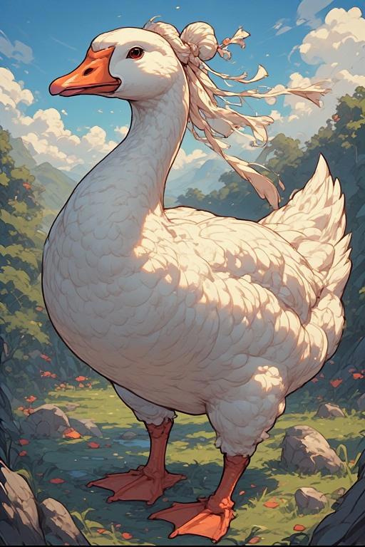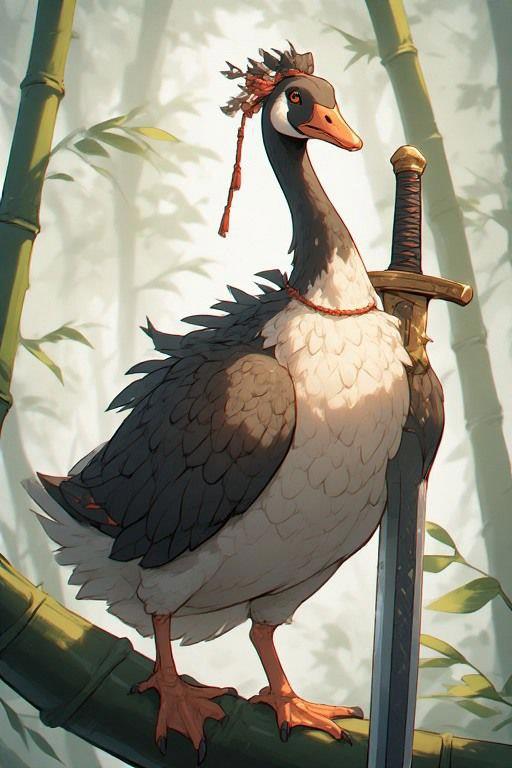 При этом наставник самый обычный гусь. Он выглядит как гусь, гогочет как гусь и щиплет травку как гусь, не считая невероятного мастерства в боевых искусствах, умения обращаться с цзянем и удивительного контроля тела.