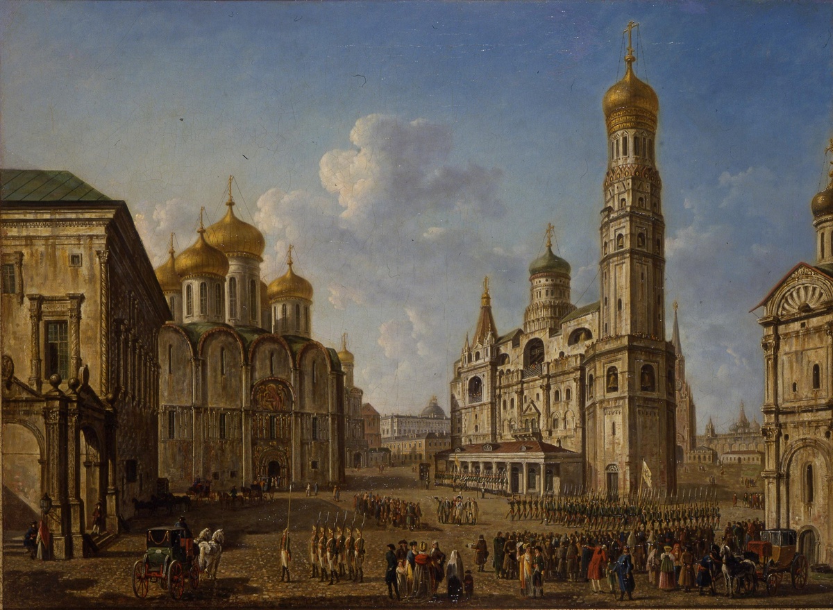 Картина Фёдора Алексеева «Развод войск в Московском Кремле. Соборная площадь». 1800-1801 гг.:
