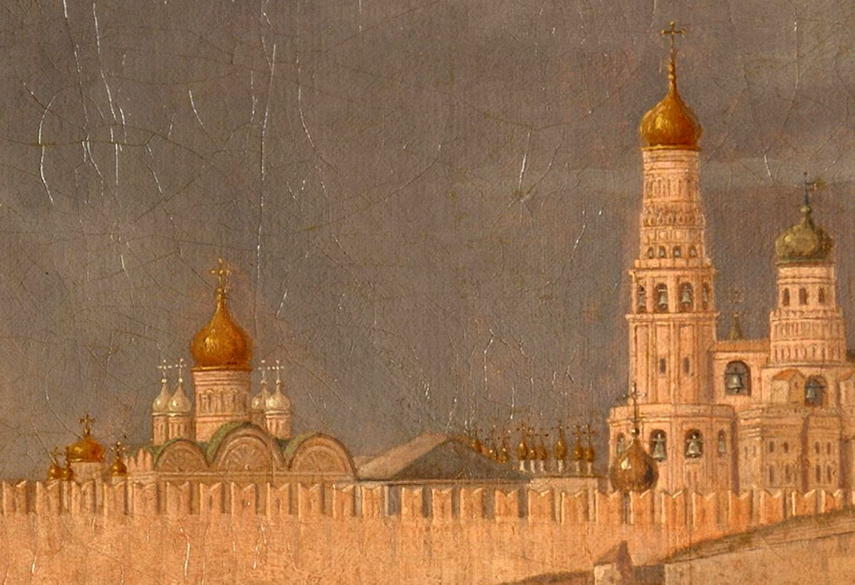 Французский живописец Жерар Делабарт работал в России с 1787 по 1810 год, в Москве и Петербурге. С одной Москвой у него только 15 картин, ниже привожу несколько фрагментов, попробуем среди них найти папские кресты. Вид на Москворецкий мост и Кремль: