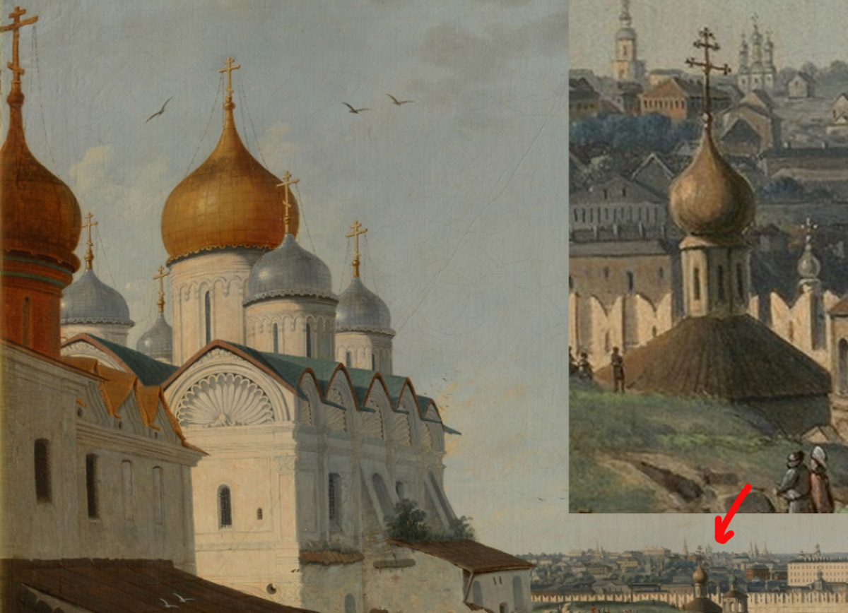 Имеется множество картин, на которых отчётливо видно четырёхконечные или восьмиконечные кресты (подробнее о крестах на православных куполах по ). Например, на картинах Фёдора Алексеева папских крестов нет.