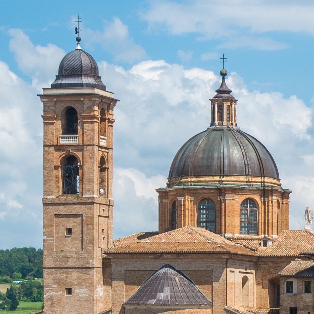 Образцом восьмиконечного креста на медали мог стать шестиконечный крест, который встречается на католических храмах (похожий на архиепископский). Если добавить снизу еще одну перекладину, получим именно то, что на наполеоновской медали. Ниже пример такого креста на куполе католического собора в городе Урбино, Италия: