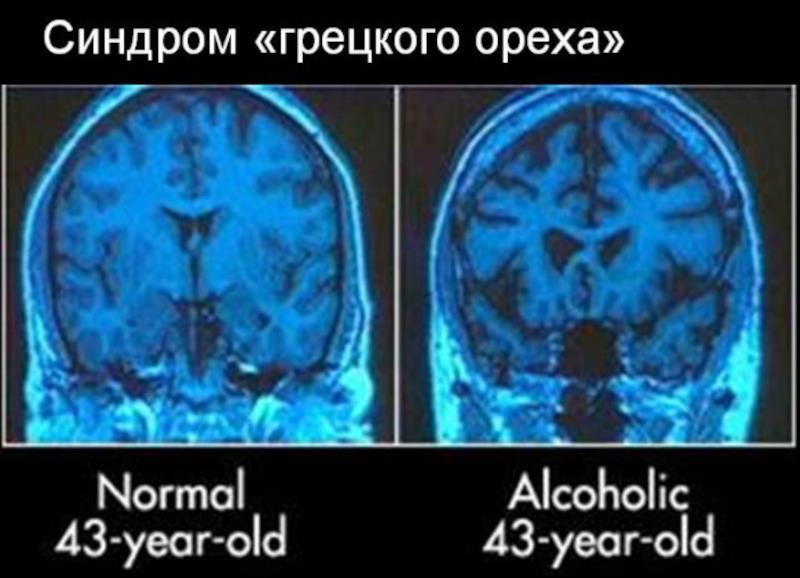 Алкогольная атрофия мозга (Alcohol-related brain atrophy) развивается при длительном и частом употреблении. Эта патология также известна как синдром грецкого ореха, поскольку мозг алкоголика «съеживается» и уменьшается настолько, что напоминает орех[8].