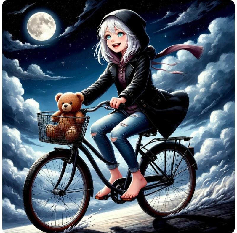 Через минуту Михасик сидел в багажной корзинке над рулевым колесом, а велосипед летел по чёрному небу над седыми заснеженными лесами, над бесконечными белыми полями, над спящими мёртвым сном городами. Марьяна крутила педали и напевала песенку, похожую на вой метели.