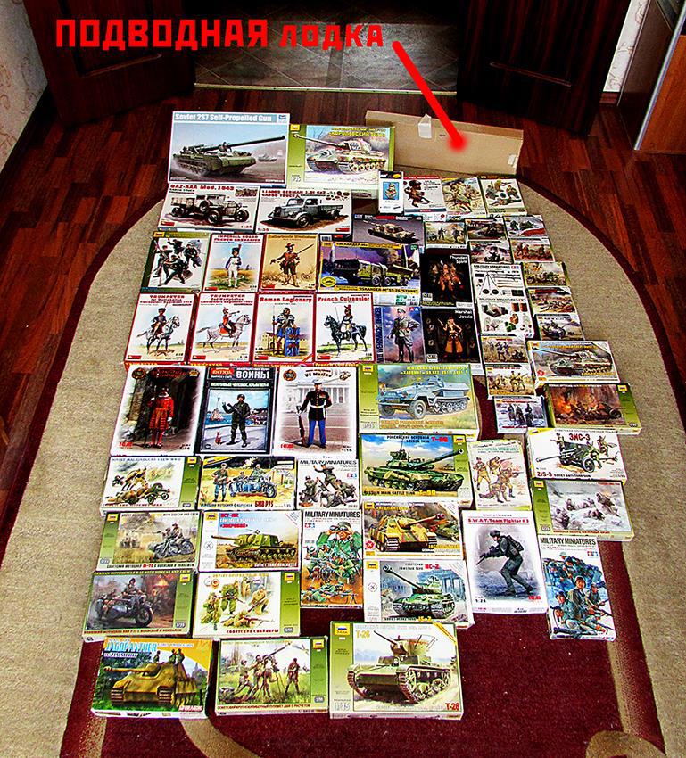 Специально полазил по закромам (а какой моделист не "хомяк"?) и расставил всё аккуратно для фотосессии. А безымянную коробку на заднем плане- даже подписал для привередливых, что это - "подводная лодка" в не собранном состоянии.