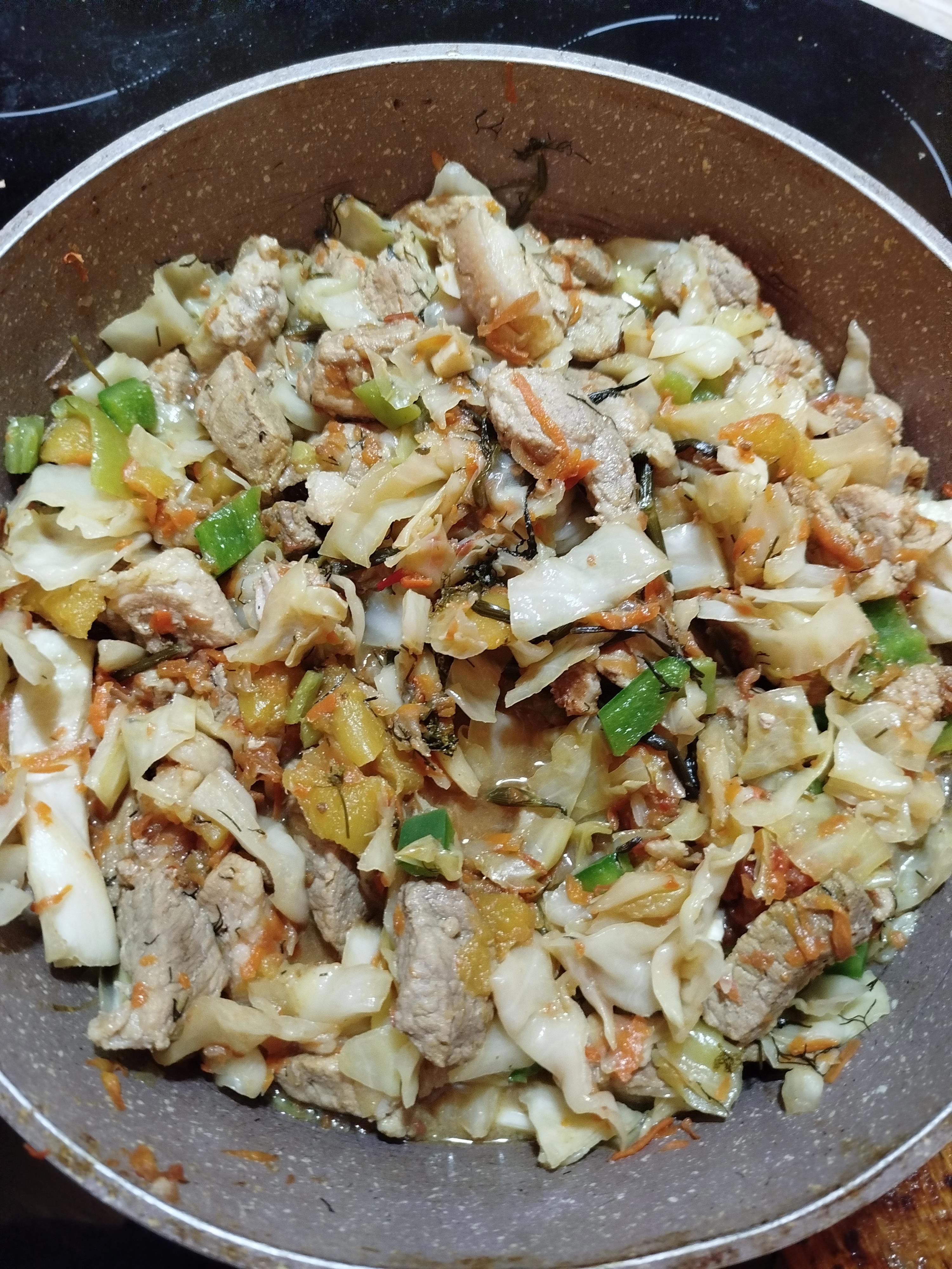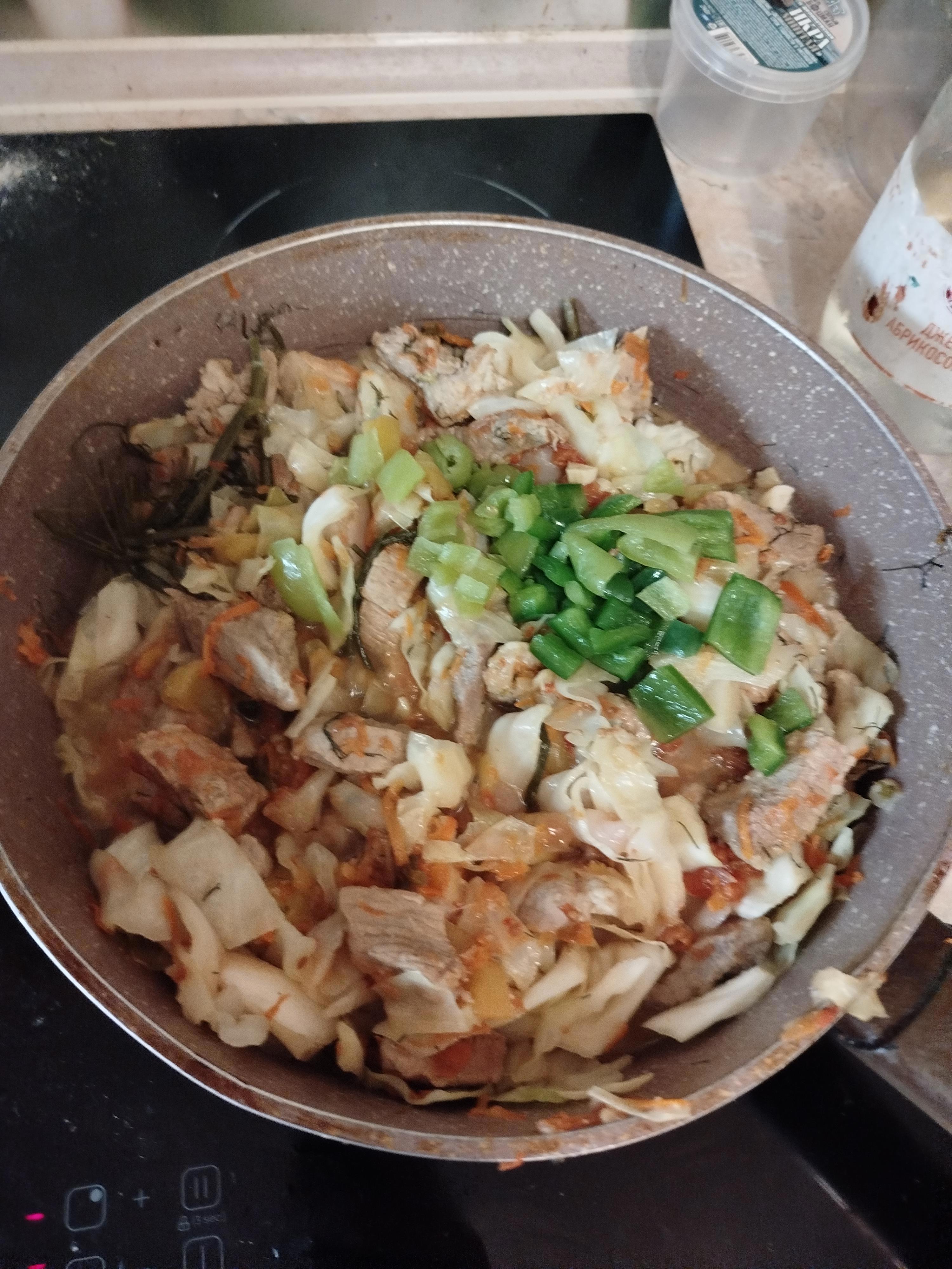 Добавил морковки, капусты, укропа. Добавляем также перец. После все тщательно перемешиваем и тушим пока капуста не сварится. Примерно еще минут 40.