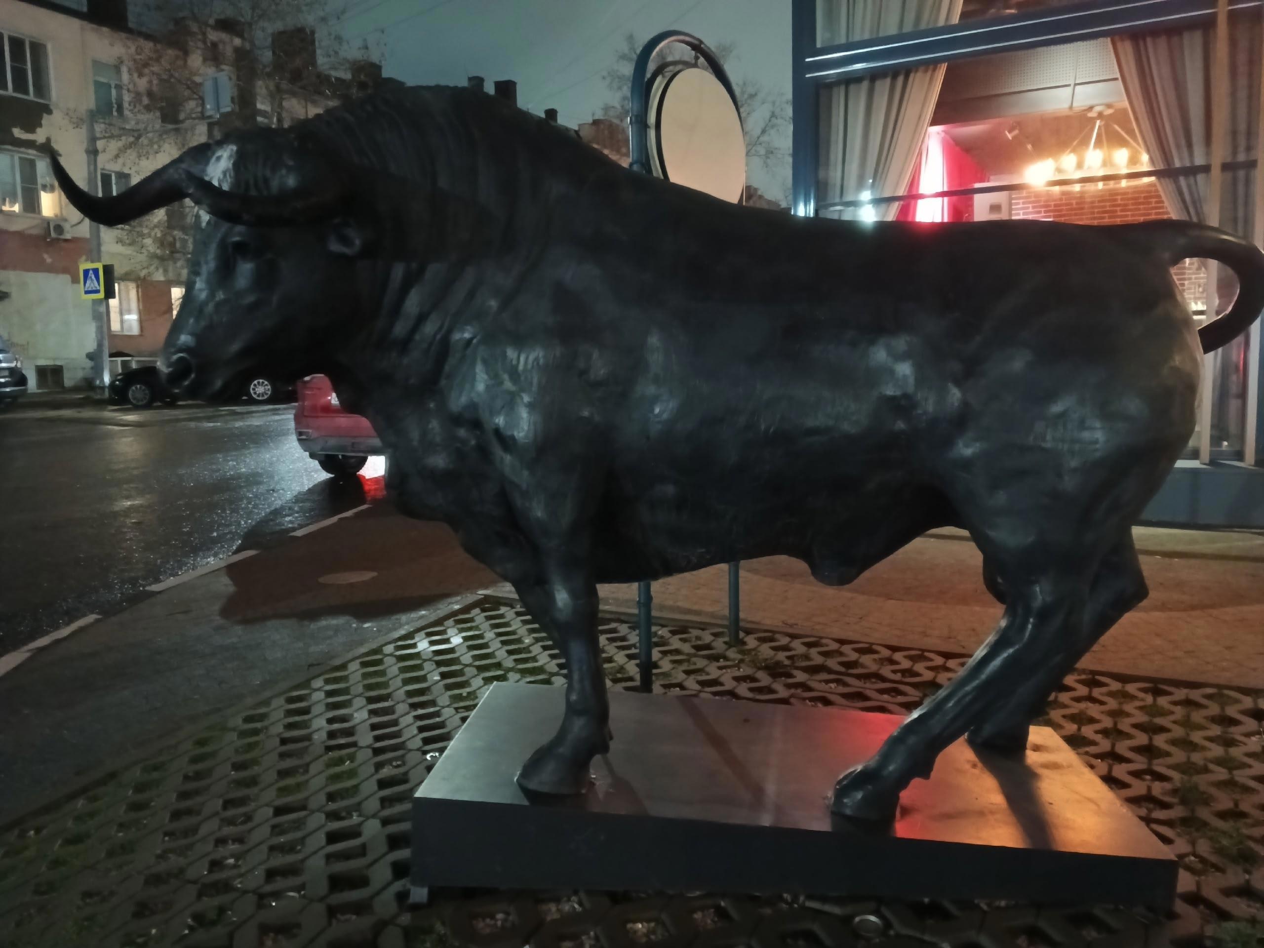 После ужина мы заскочили в магазин и вызвали такси. Топать в горку по темноте то ещё удовольствие. Да и папуля соскучился в гостинице. Ожидали мы такси возле вот такого быка.