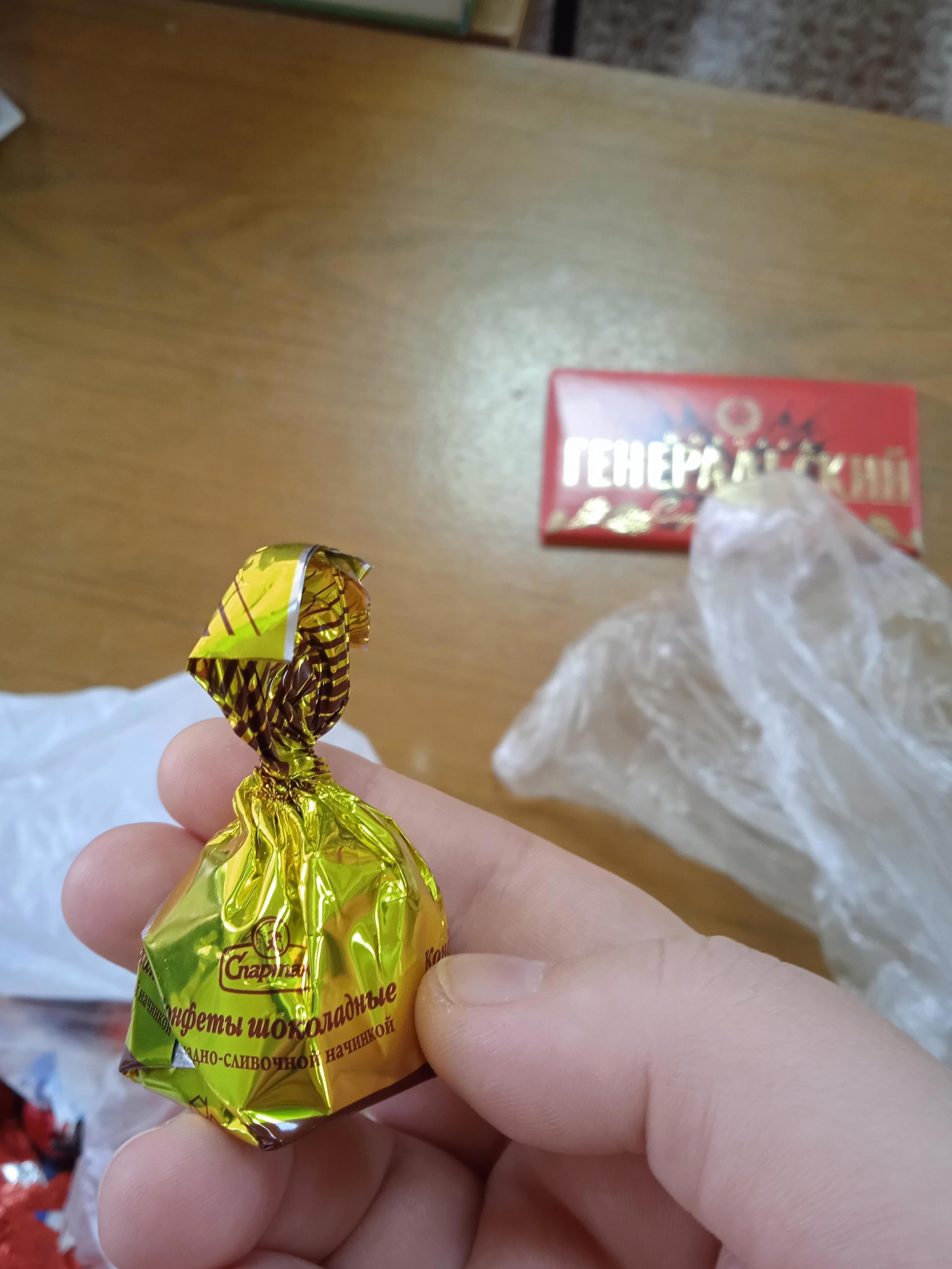 Вот, к примеру, конфетка в золотистой обертке - "Конфеты шоколадные с помадно-сливочной начинкой".