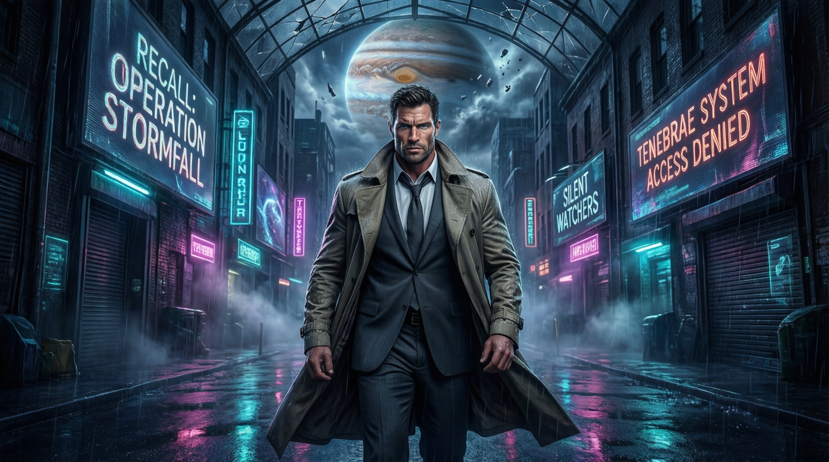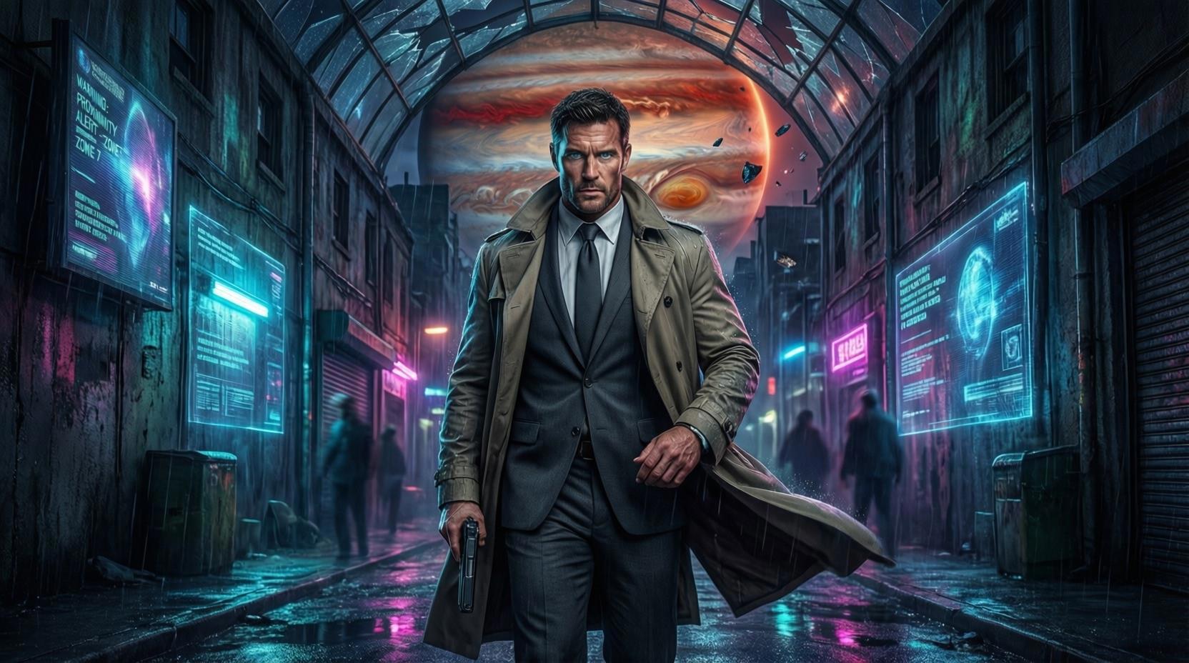 На первых трех - главный герой, Нэйтан Райан, детектив отдела тяжких и особо тяжких преступлений на захолустном шахтёрском планетоиде. На двух - весь официальный и при параде, на третьей - умаялся и топает домой со смены, уже без галстука. :)))