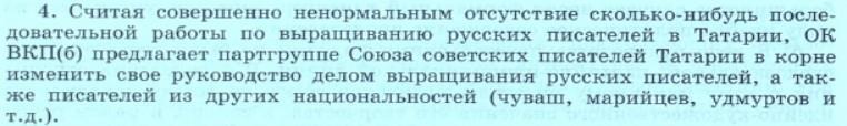 Там же требование с 1 января 1937 издавать журнал на русском языке для популяризации татарских писателей среди русских читателей. с 1 декабря 1936 организовать курсы-семинары для писателей и критиков при Институте марксизма-ленинизма, а также организовать встречи-семинары-разборы произведений силами самих писателей.