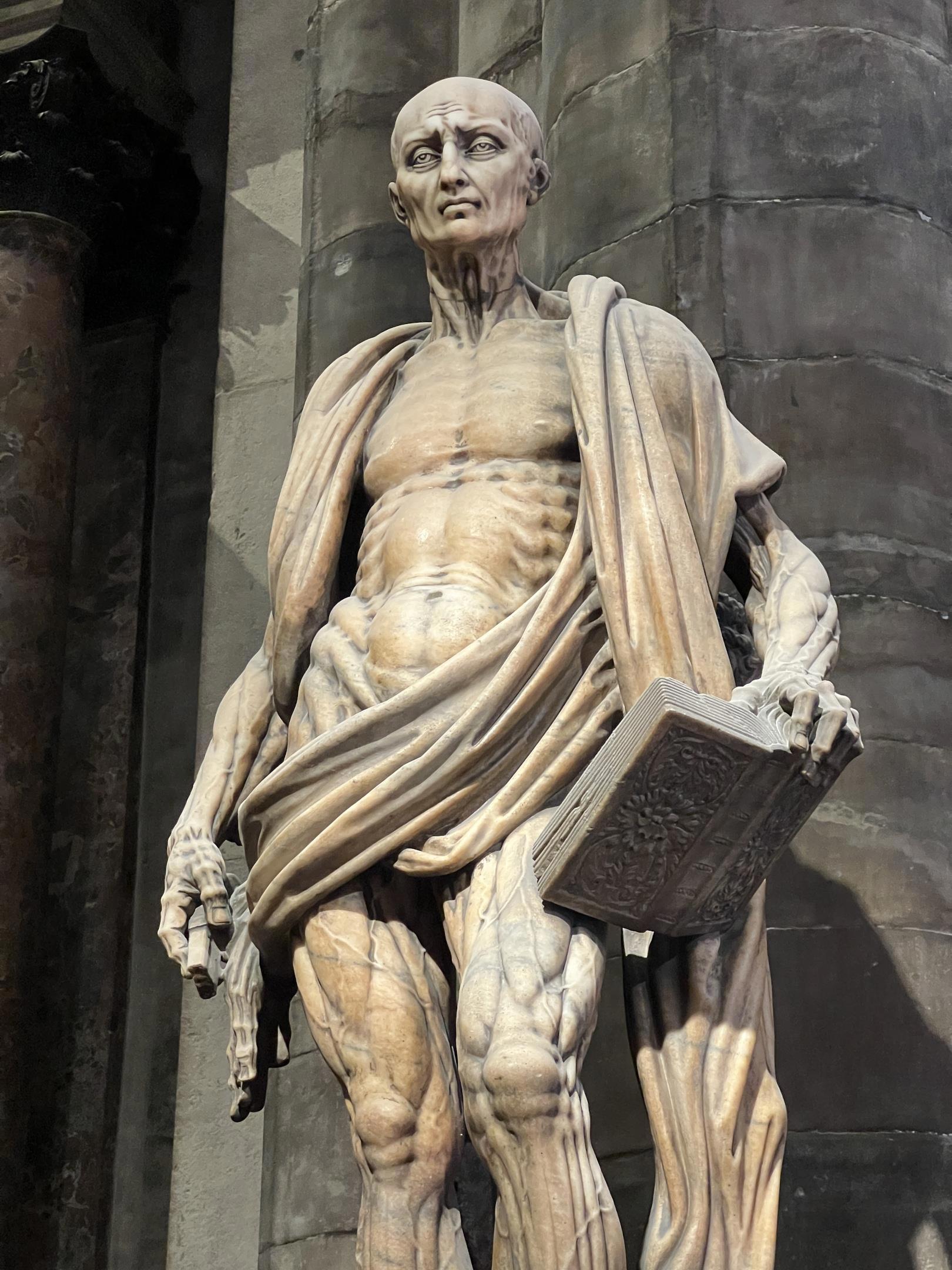 По преданию, Варфоломея наказали за обращение людей в христианство, содрав кожу заживо. Именно она изображена на фигуре как будто бы «одеяние» — и это производит сильнейшее впечатление на всех, кто подходит к статуе.