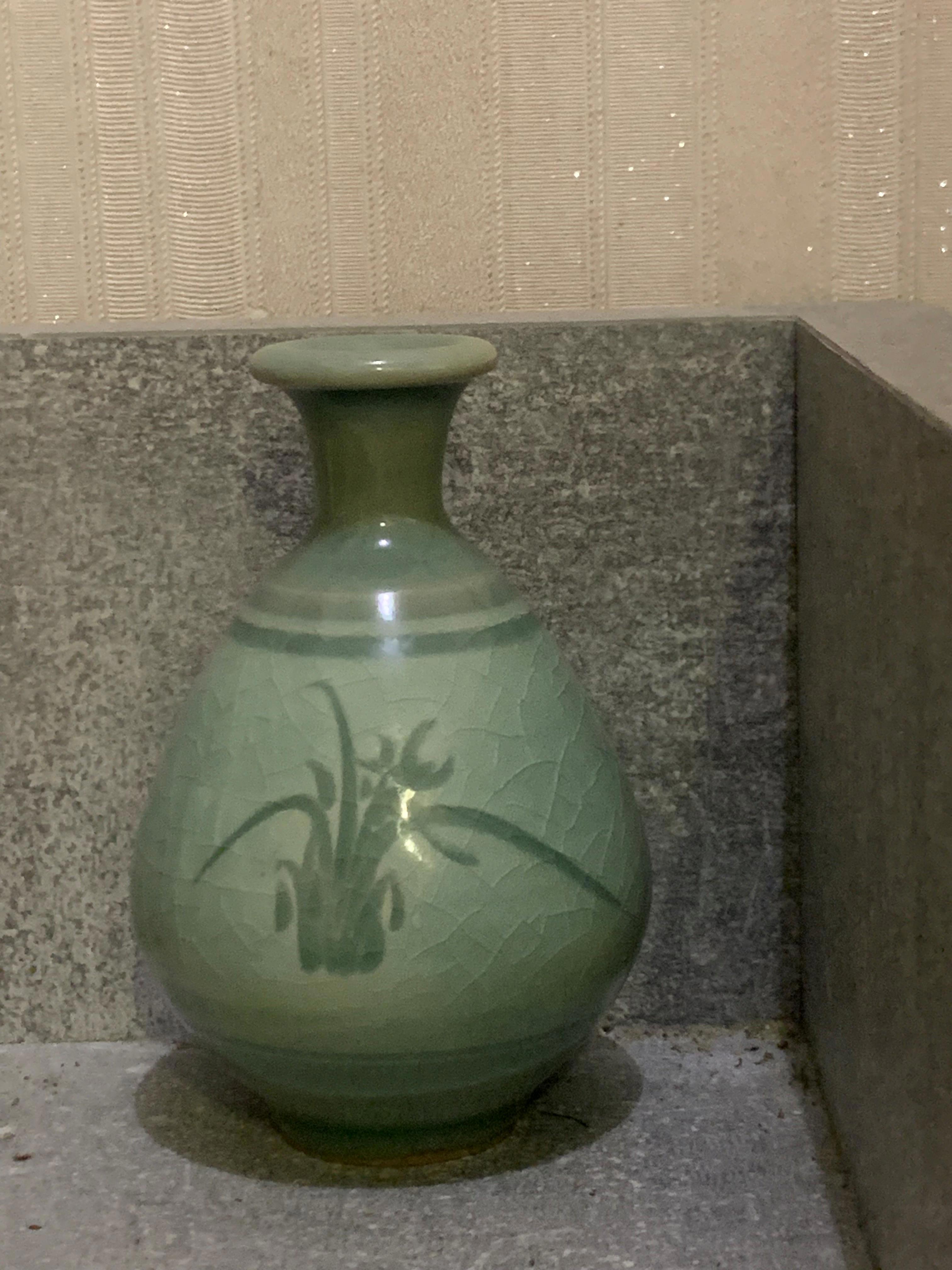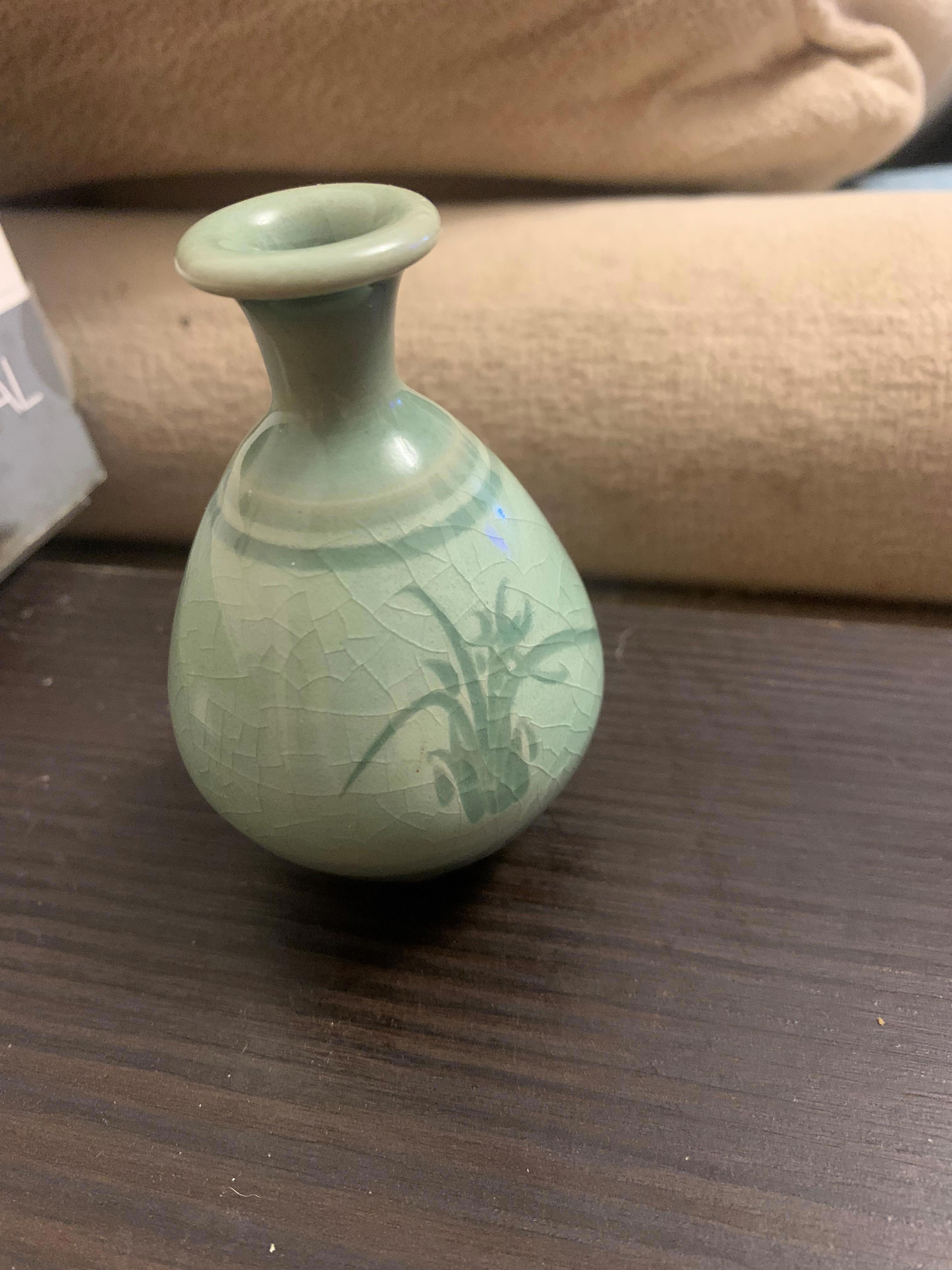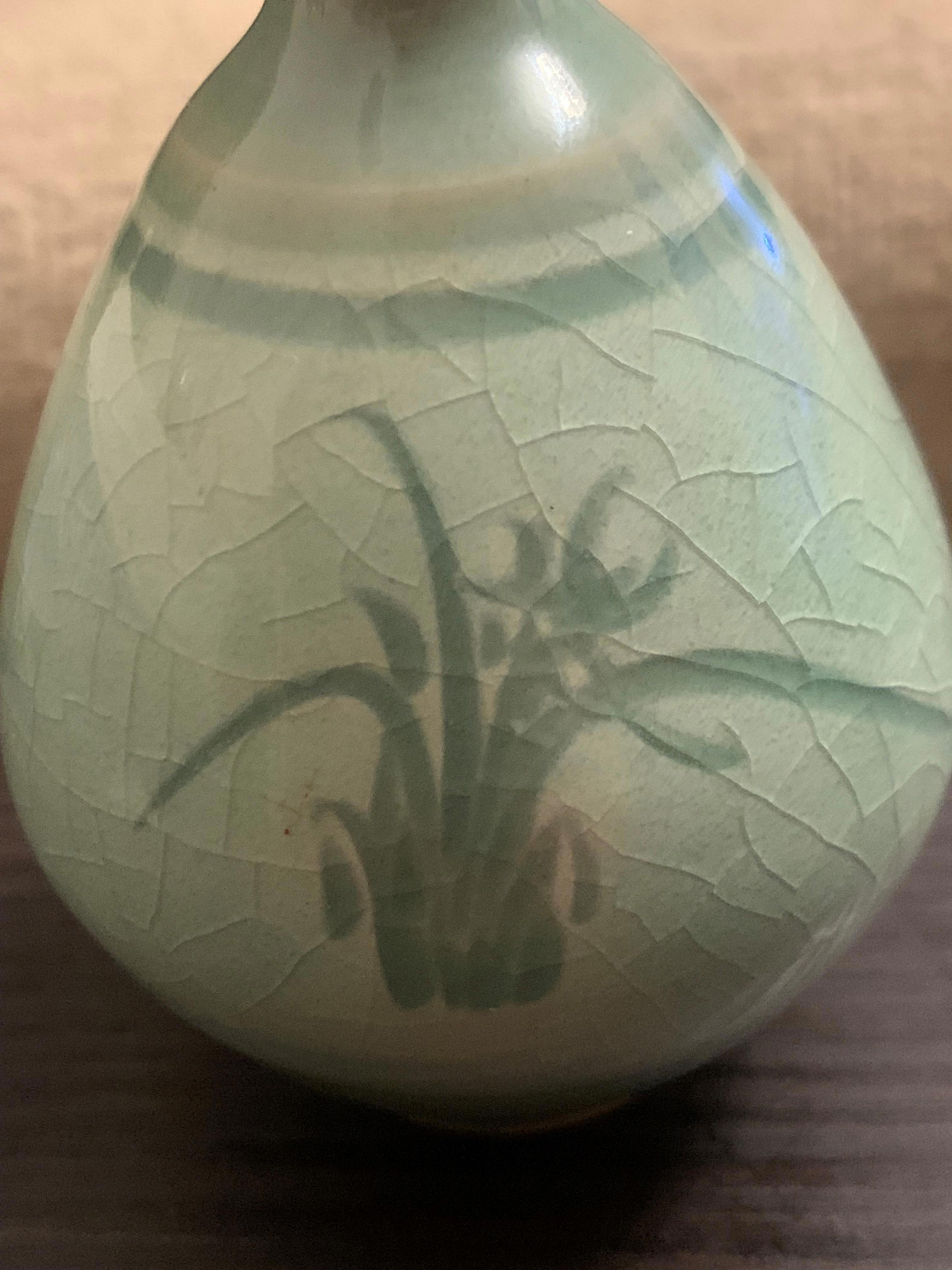 Моя вазочка выполнена в характерной бледно-зеленой гамме с использованием кракелюрной глазури (сеть мелких трещинок), что придает ей антикварный вид. Сеть мелких трещинок на глазури — это не дефект, а намеренный декоративный эффект, характерный для стиля селадон. Со временем в эти трещинки может проникать патина, делая рисунок более выразительным Подобные изделия часто называют «бутонными вазами» (bud vases) из-за их небольшого размера и узкого горлышка. На тулове вазы просматривается изображение растения с остроконечными листьями, что типично для восточноазиатских ботанических мотивов.