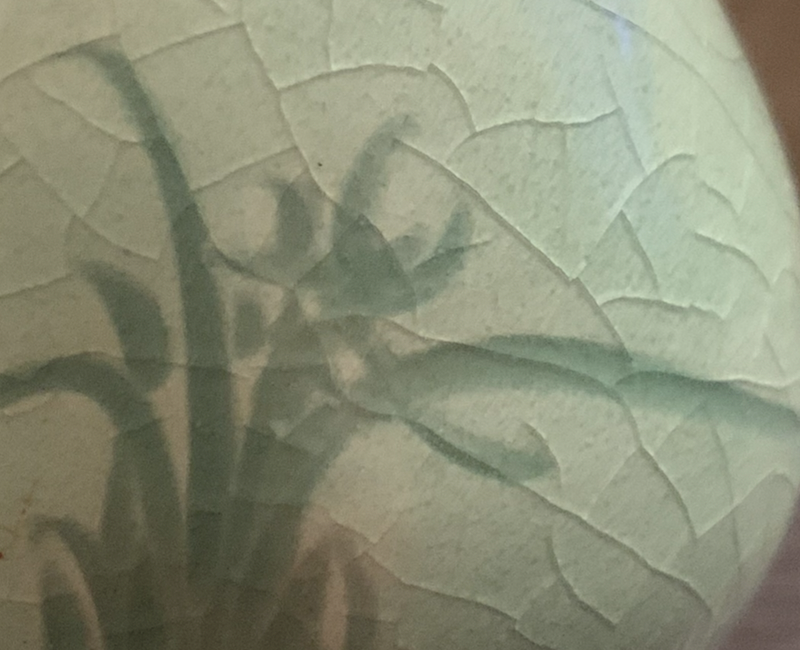 Подглазурная роспись на корейском селадоне — это очень тонкая работа мастера. Рисунок находится под стеклянистым слоем глазури, что создает эффект «аквариума». Растение кажется объемным и слегка туманным, словно вы смотрите на него сквозь толщу воды или легкую дымку. Такое изображение не сотрется со временем и будет «вечным». Кроме того , мастеру нужно было точно рассчитать, как краска поведет себя в печи, ведь под воздействием жара цвет может кардинально измениться. (Например, традиционная роспись кобальтовая роспись на сыром черепке будет коричневой и только после обжига приобрет оттенок лазурита).