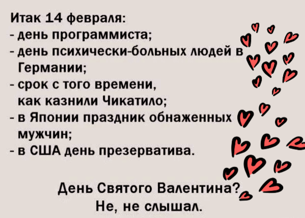 Эх, после пятницы 13, сразу нас наши головы обрушился День всех влюблённых. Давайте же отнесёмся к нему с юмором!