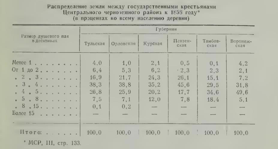 «более благоприятные условия с точки зрения земельного наделения крестьян наблюдались в Тамбовской и Воронежской губерниях, но и здесь средний надел не достигал минимальной 5-десятинной нормы...в остальных губерниях, где более половины ревизских душ располагало наделом, не превышавшим 4 десятин»
