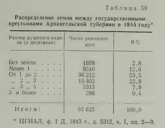 « почти все крестьянское население неплодородного северного края было лишено минимального земельного пая в 5 десятин на душу, хотя по закону крестьяне имели право получить по крайней мере 8-десятинную пропорцию. Около 70% ревизских душ владели менее чем 2 десятинами «лесной и безлесной земли», т. е. располагали полевыми наделами, которые были далекими от самого жалкого прожиточного минимума.»