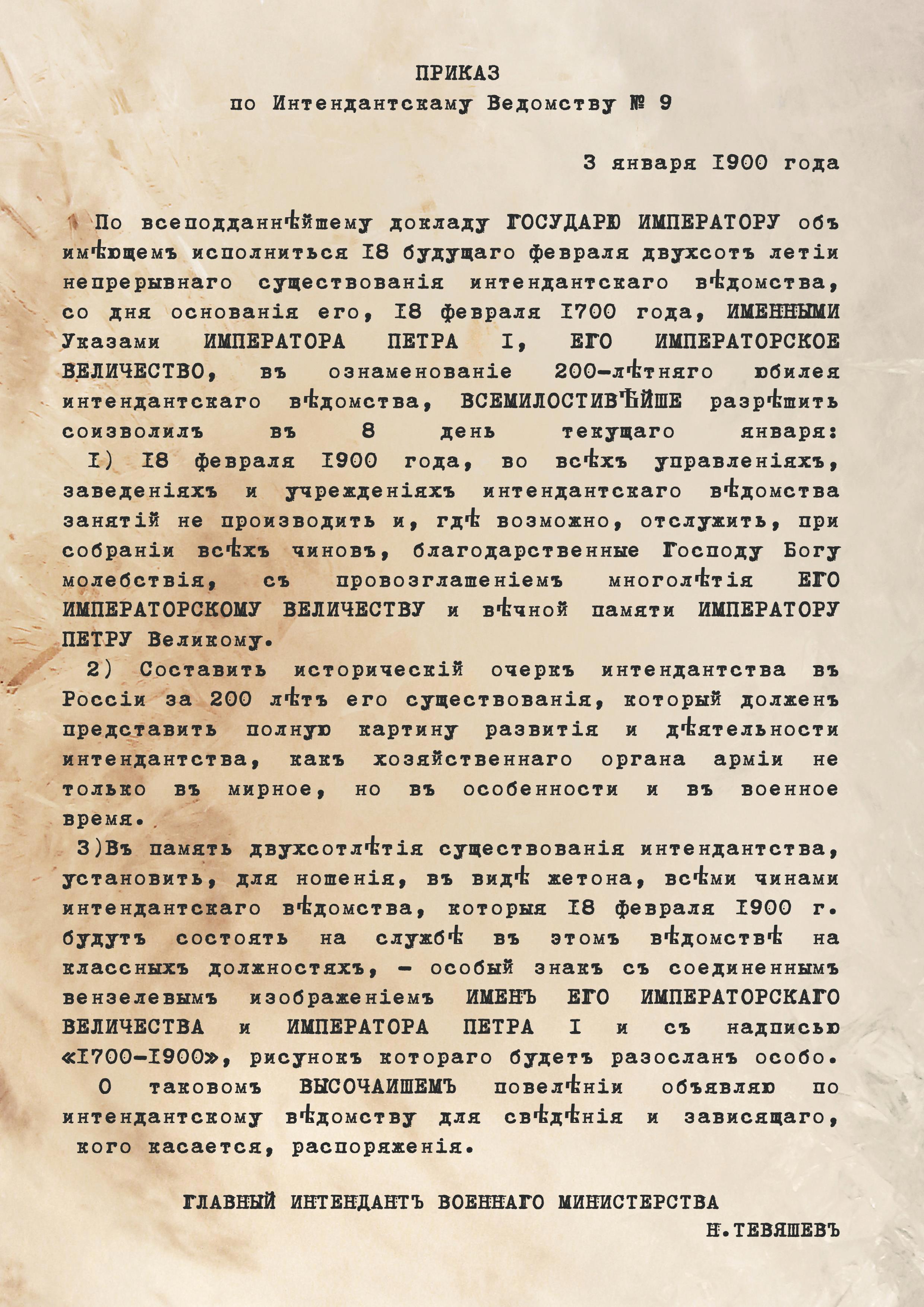 Приказ по Интендантскому ведомству № 9 от 3.01.1900 г. (реконструкция)
