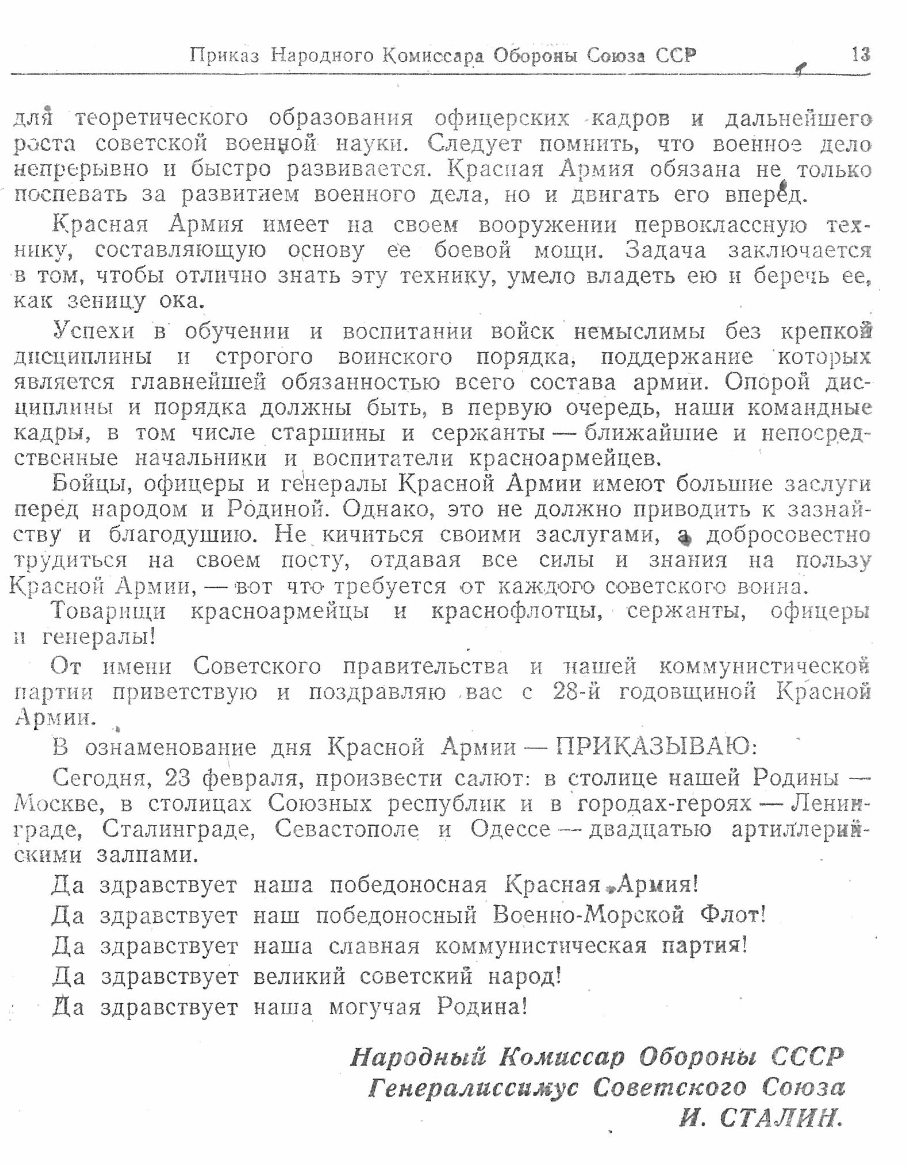 Но, в праздничный день не будем о грустном. Сегодня вашему вниманию предлагается праздничный приказ, подписанный и опубликованный ровно 80 лет назад, к 28-й годовщине Красной Армии.