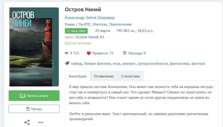 Автор: Валерий БелорусС творчеством этого писателя я познакомился на Целюлозе, но там и читалка плохая и обратная связь не очень. Так что когда Александр появился на АТ я был рад. Пишет быстро, с хорошей фантазией и в целом грамотно, но на АТ пока мало известен. Сходу выложил старые книги по крутым ценам, но сейчас цены здорово уменьшены и вполне доступны для рядового читателя. Я хочу рассказать про книгу "остров Ниней" https://author.today/work/57294