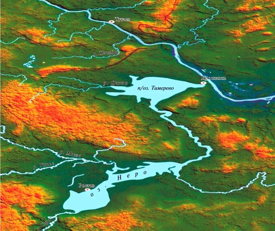 А может такая территория не одна? Нет, это даже не версия, а почти точное знание. И вполне определённо об этом говорят не только такие явные места, как прикаспий, приаралье, причерноморье с Полесьем, но и другие места, которые можно найти на территории земной тверди, которая находится под нашими ногами. Об этом говорят не какие-то Волжские меловые горы, которые сформировались миллионы лет тому назад, а вполне даже исторические времена. Например, говорят, что город Ярославль был основан на берегах древнего палеоозера, которому даже название дали – Тимерово. Даже схемку с высотами показывают. Вот такую: