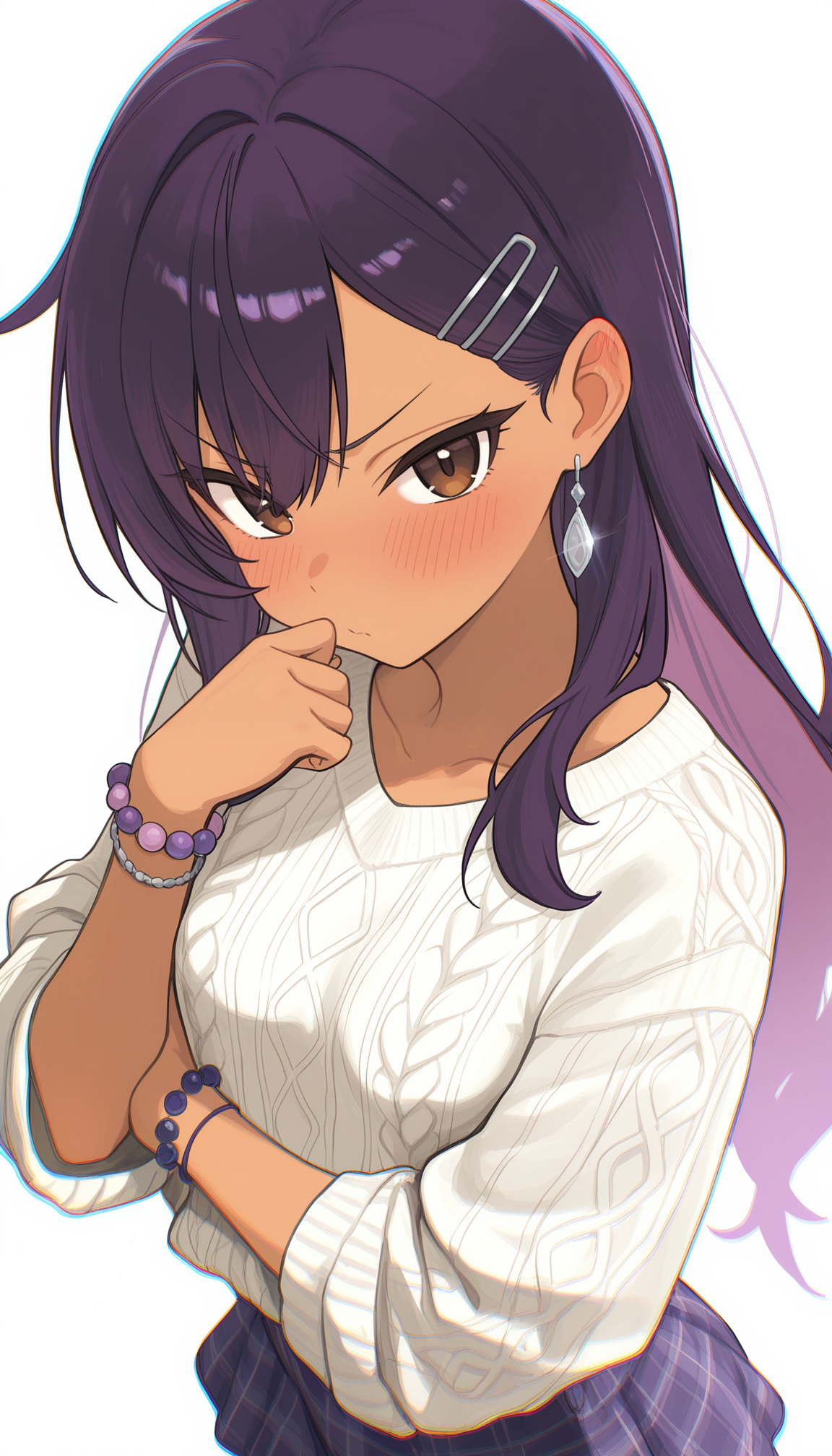 Знаете, когда я впервые увидел Юдзу в своём воображении, я сразу обратил внимание на её глаза. Они не просто карие — они с лёгким приподнятым внешним уголком. Те самые «кошачьи глазки», которые придают её взгляду что-то неуловимо хитрое, даже когда она совершенно серьезна.