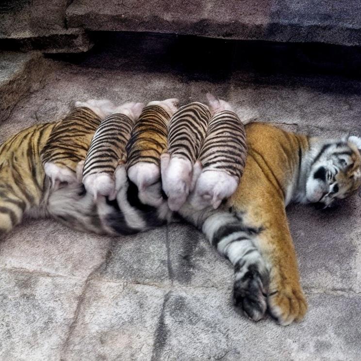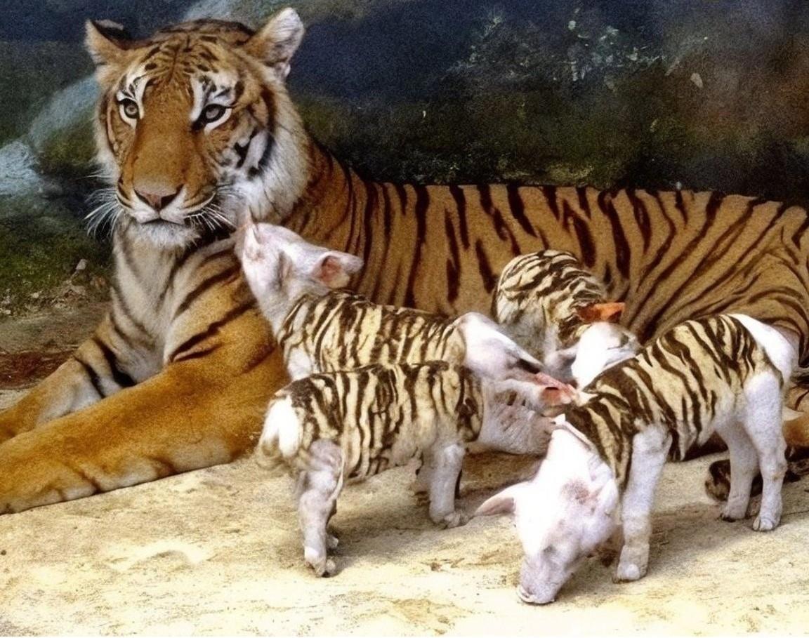 В одном из зоопарков Таиланда тигрица по кличке Саймай тяжело переживала утрату своих детёнышей и перестала проявлять интерес к окружающему миру. Видя её состояние, смотрители решились на необычный шаг. В вольер к тигрице подселили маленьких поросят — в полосатых костюмчиках, напоминающих тигриную окраску.