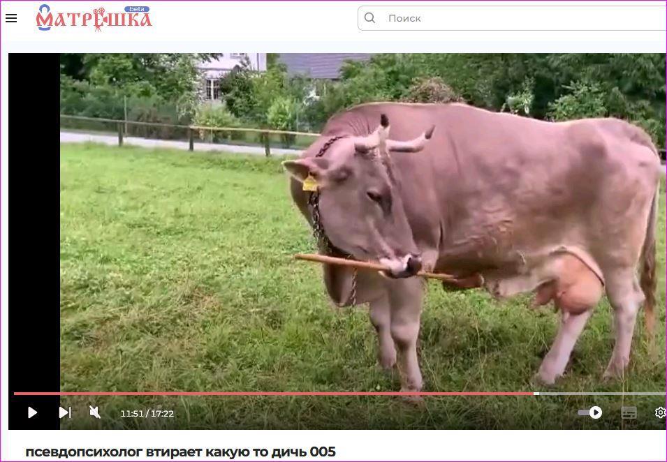 Свой стёб над чушью и бредом псевдопсихологов он оформляет в виде фото- и видео- иллюстраций к высказанному этими днищами и закачивает на видеохостинг "Матрёшка". В пятой части вы можете наблюдать - какие люди - глупые и какие животные умные. И, в частности, полюбоваться на умную корову (см. скриншот):