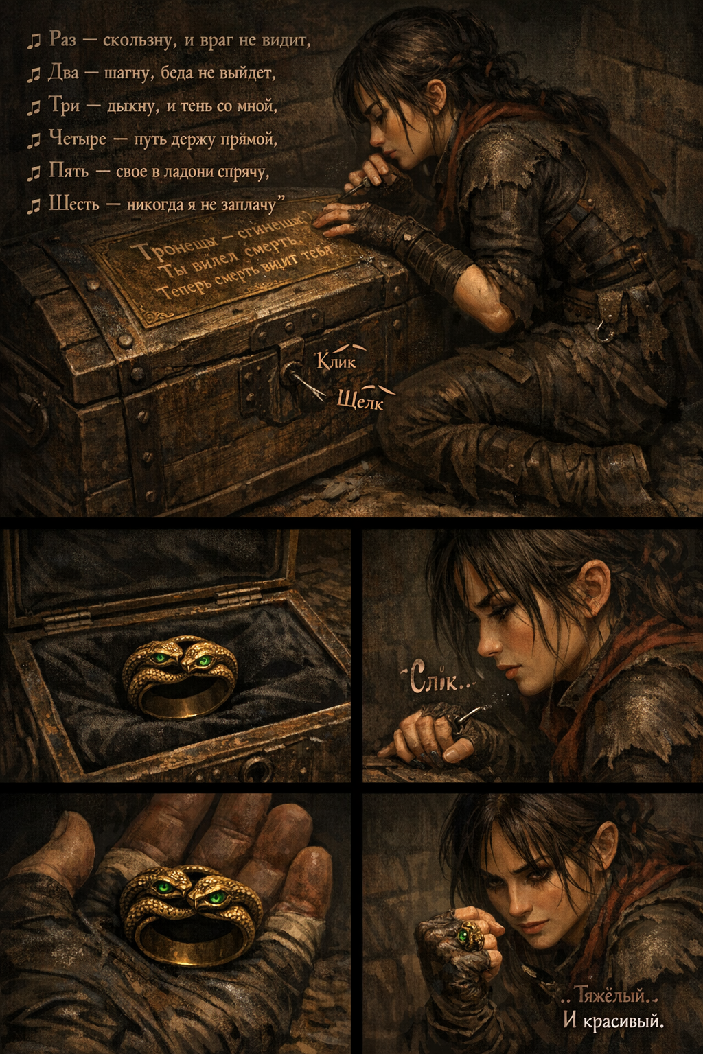 На чёрном бархате лежал перстень. Не просто украшение — сгусток власти. Две золотые змеи с изумрудными глазами сплетались в вечной борьбе. Металл был неестественно холодным, словно впитал холод всех подвалов Вереи. Лис протянул руку. Айка резко её оттолкнула и схватила первая. Лицо гривца дёрнулось, как у ребёнка, у которого вырвали сладость.