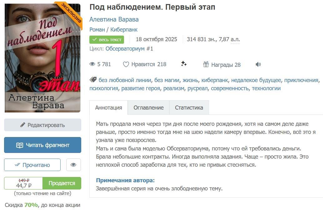 Автор: Алевтина ВараваРади чего в недалёком будущем на базе стриминговой платформы моделей, транслирующих кусочки своих жизней через скрытую камеру на шее, выкупили круглосуточное время новорождённого младенца? Ева Свиридова носит камеру Обсерваториума двадцать лет, привыкла жить так и получать повышенные выплаты. Но вскоре после смерти матери, заключившей непонятную сделку, от наблюдателя начали приходить странные задания...