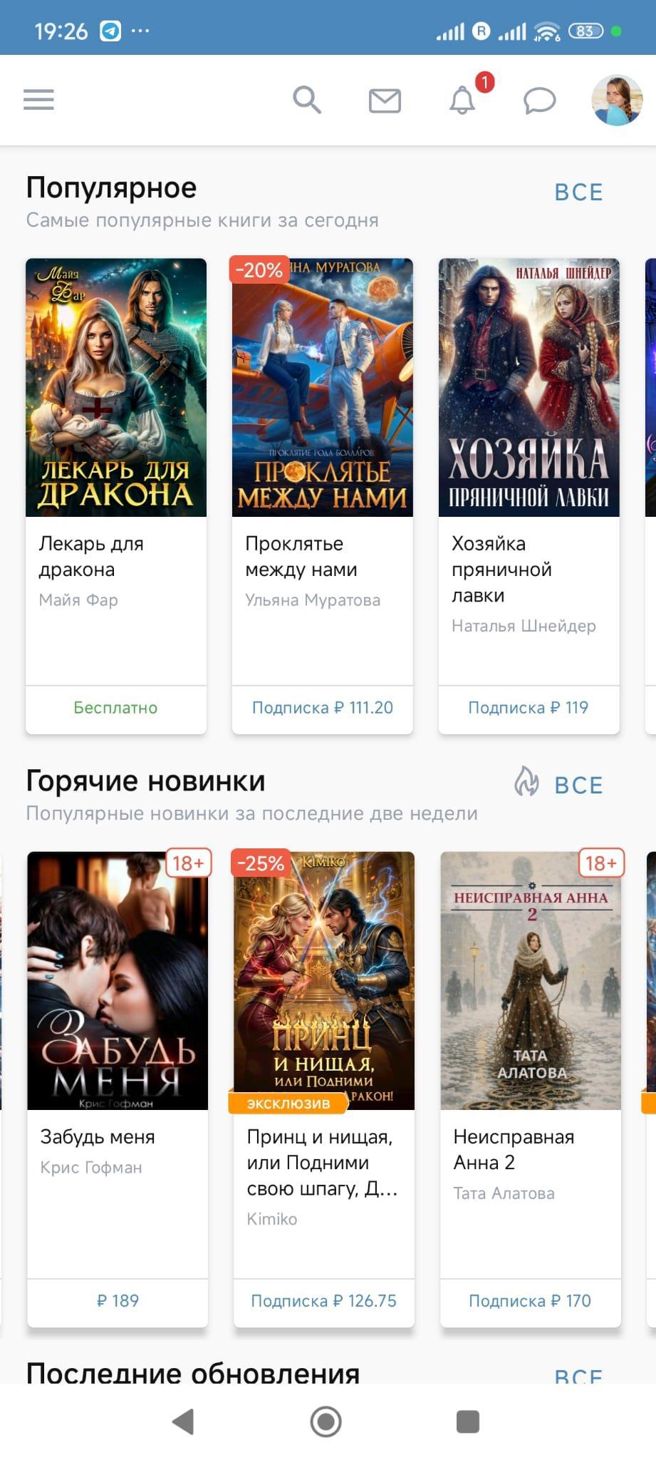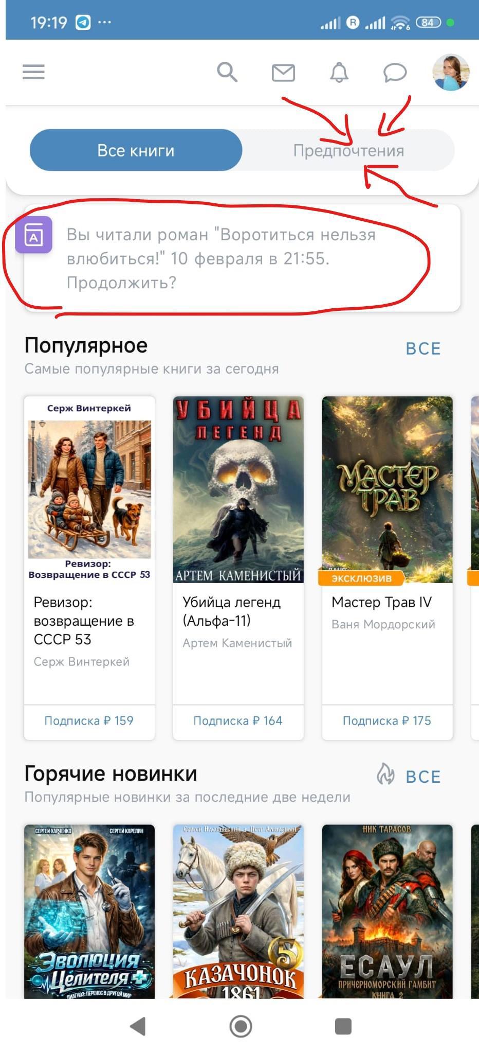 Во-первых, система предлагает нам прододжить книгу, которую мы читали последней. Я просматривала с телефона главы, чтобы сделать скриншот, и система меня отсылает обратно в мою книгу.