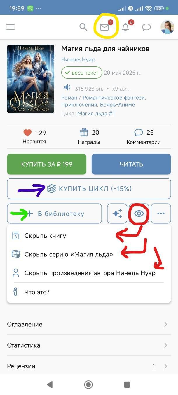 Теперь о кружочках. Обведённый красным глазик раскрывает менюшку, в которой вы можете скрыть конкретную книгу, всю серию или все книги автора. Это удобный инструмент для разочаровавшихся