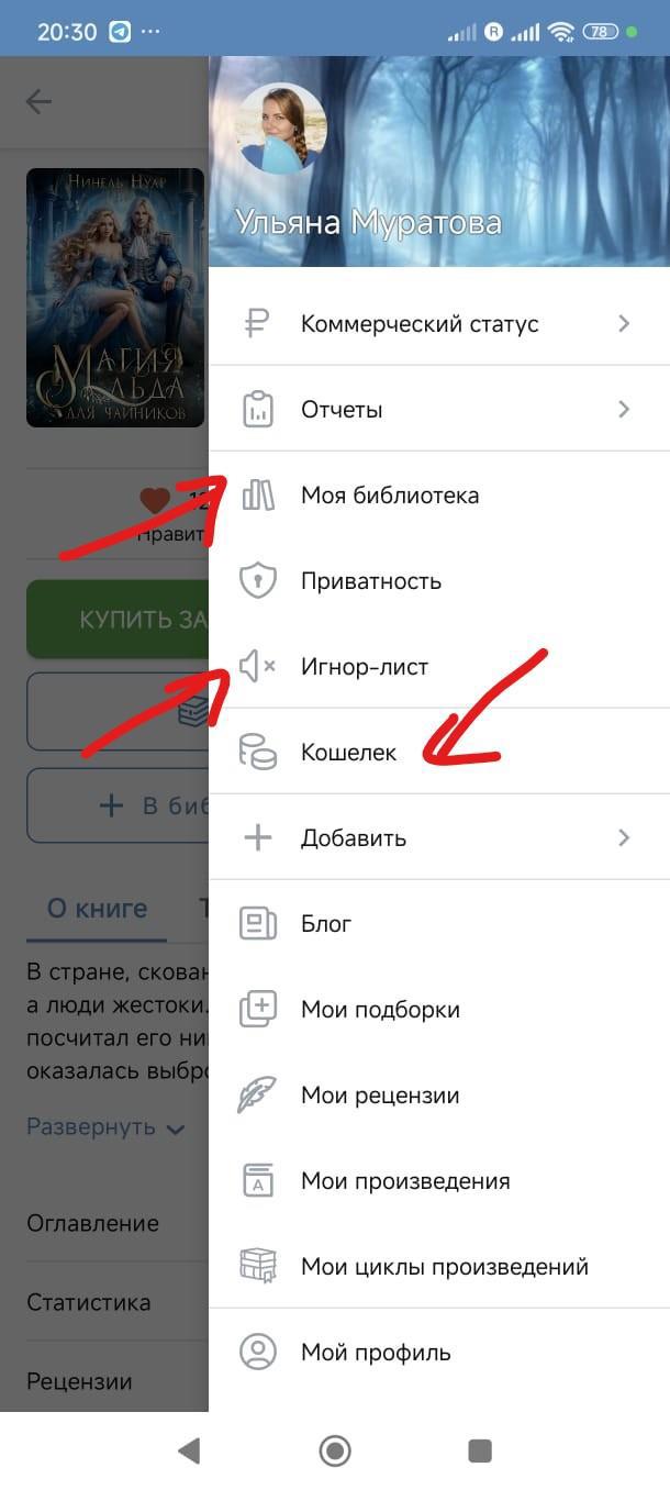 Вроде бы все основные моменты я осветила. В левом боковом меню можно найти литмобы и конкурсы, в правом -- библиотеку. Я чаще всего пользуюсь кошельком -- пополняю его на определённую сумму, а потом уже трачу. Это удобнее, чем каждый раз искать карту для оплаты.