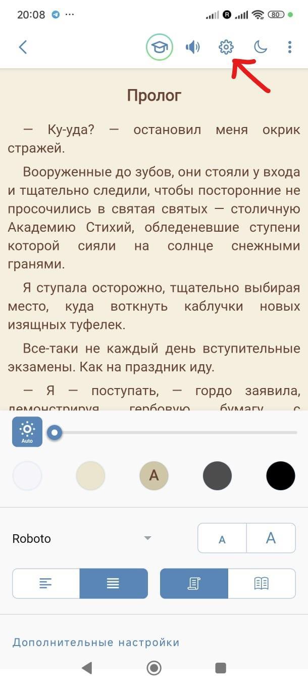 Шестерёночка приведёт нас в настройки, где можно поменять фон, цвет текста, способ листания и прочие штуки. У меня всё настроено для моего удобства, вы можете выбрать и цвета, и шрифт, и яркость.