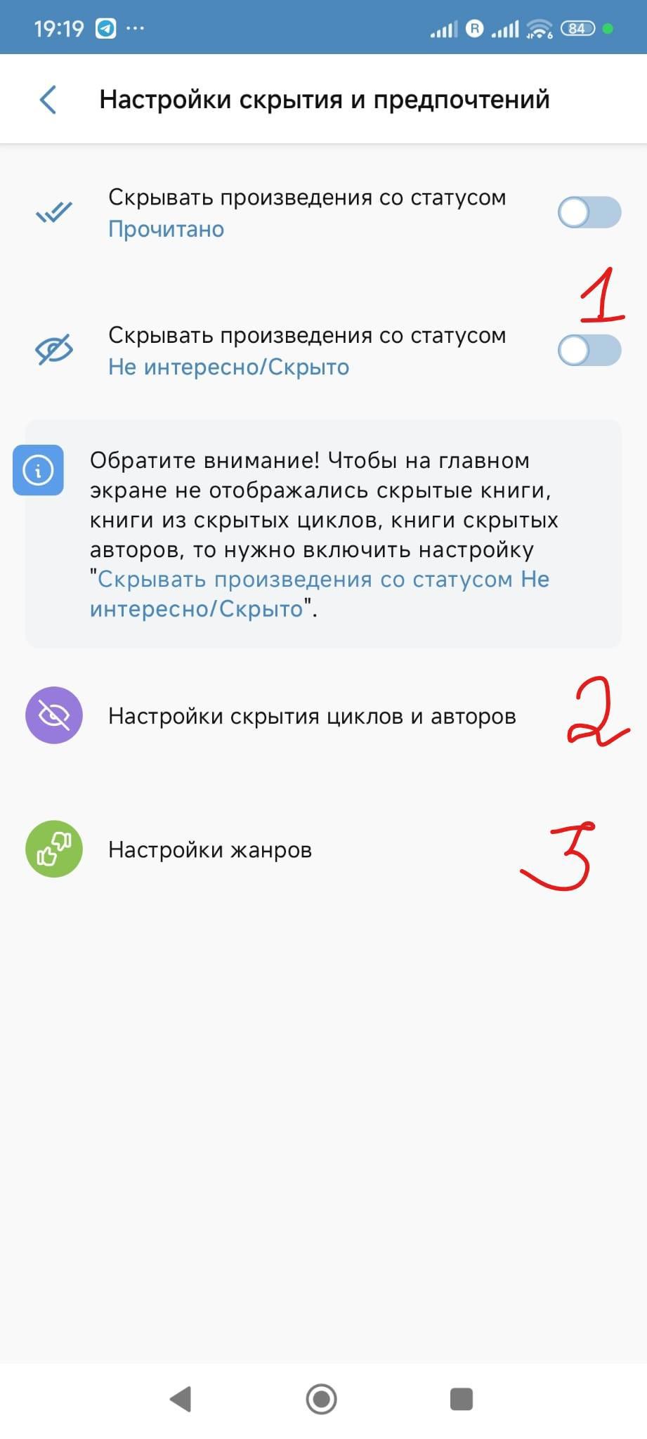Второе: Вы также можете скрывать циклы и жанры целиком. Не любите Тёмное Фэнтези? Можно сразу его убрать, чтобы даже не попадалось. Вас разочаровал какой-то автор? Его тоже можно просто скрыть.