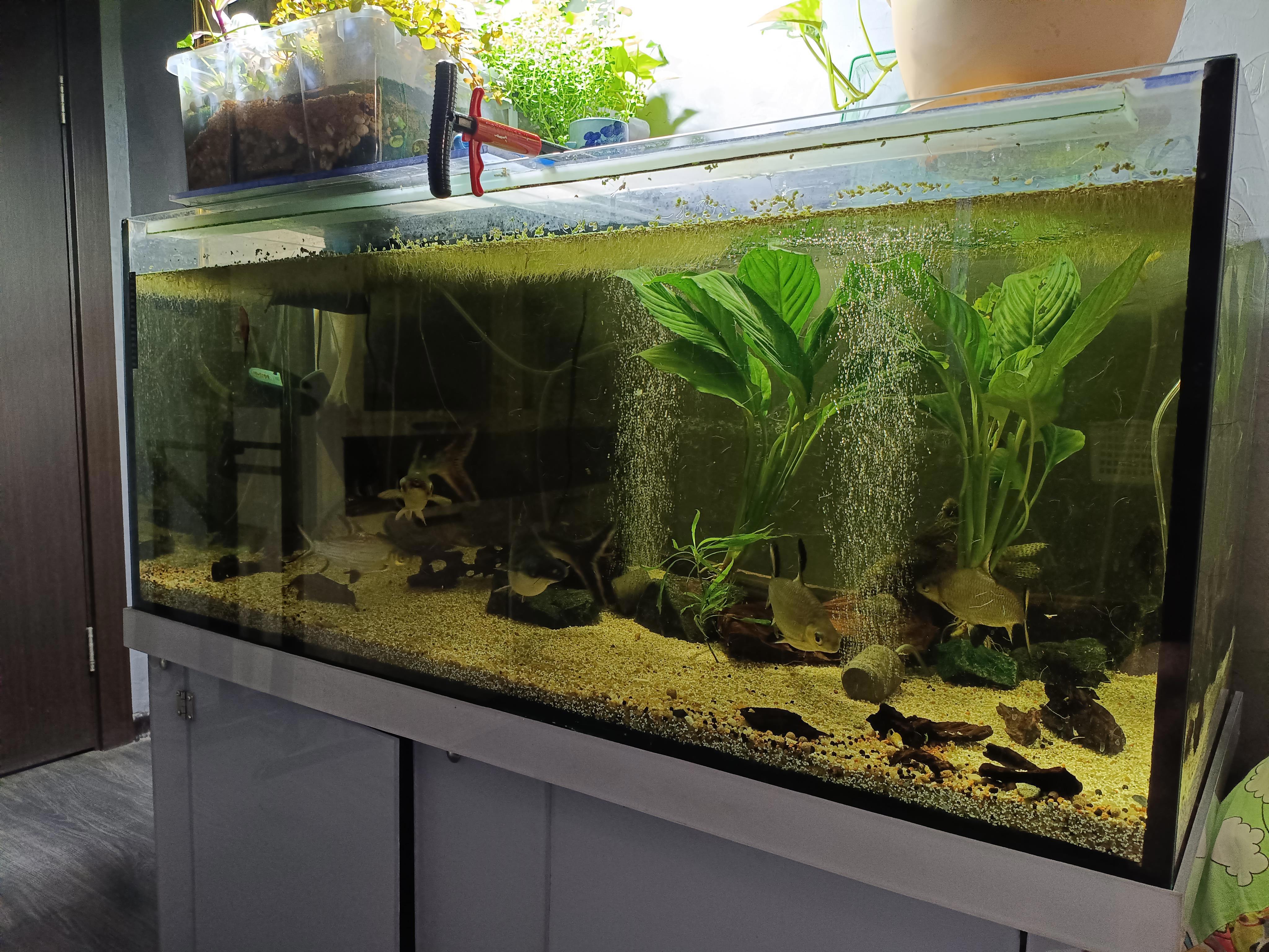 Автор: Павел КуперВ этом аквариуме у меня барбусы по 25 сантиметров, пангасиусы по 35-40, мастацембел 70 см и синодонтисы вуалевые по 20 см.