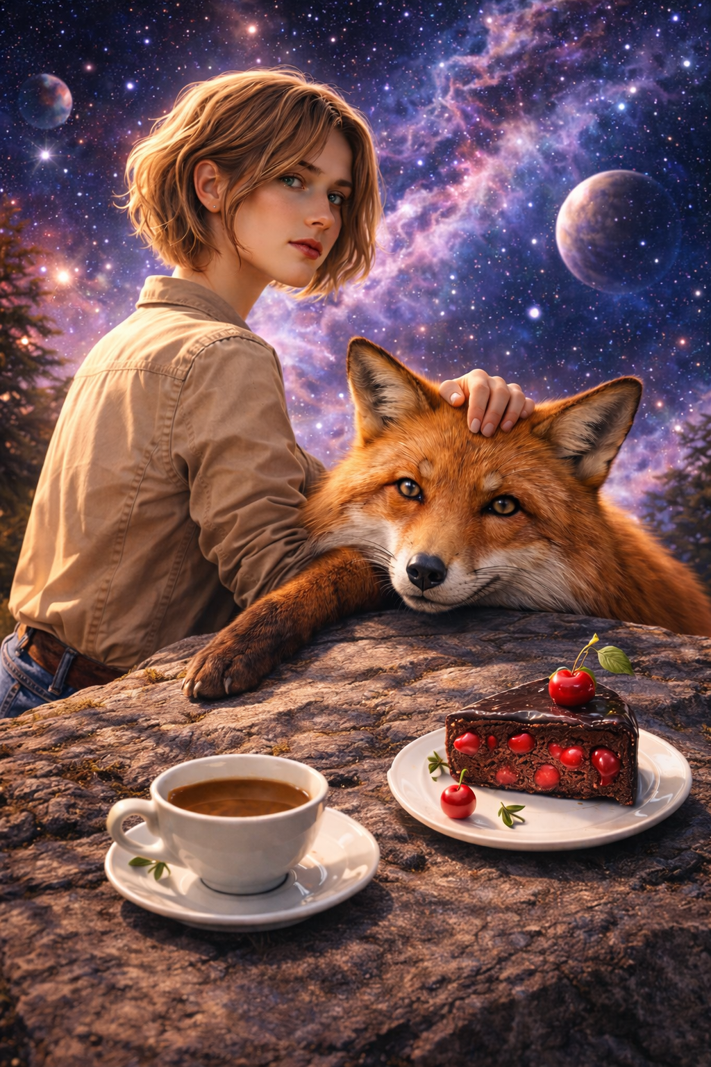Мох покрывал не только всю землю, но и обломки чёрных и тёмно-красных с розовыми прожилками камней, раскиданных по небольшой полянке. Не забрался он лишь на отполированный кусок угольно-чёрной скалы, служившей столом. Полянку окружал туман, через просветы в котором не только сверху, но и по бокам виднелось звёздное небо. Мы как будто парили в космосе.