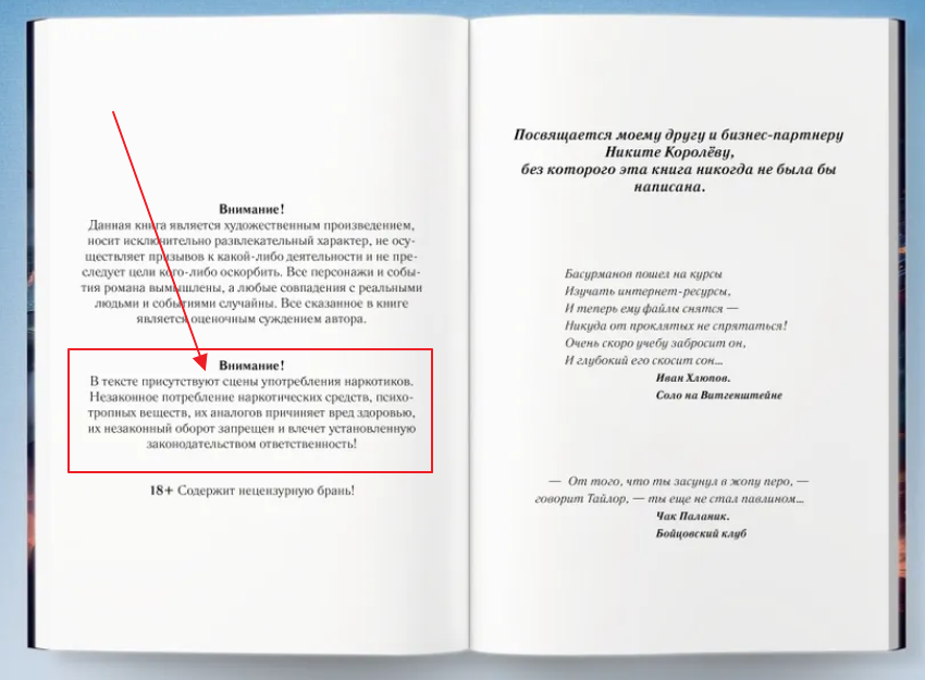 По большому счету, издателю достаточно просто промаркировать книгу, то есть, поставить треугольник с восклицательным знаком на ее обложке, а на третьей странице издания добавить дисклеймер: «Незаконное потребление наркотических средств, психотропных веществ, их аналогов причиняет вред здоровью, их незаконный оборот запрещён и влечет установленную законодательством ответственность», вот и всё, и Закон будет соблюден на 100%.
