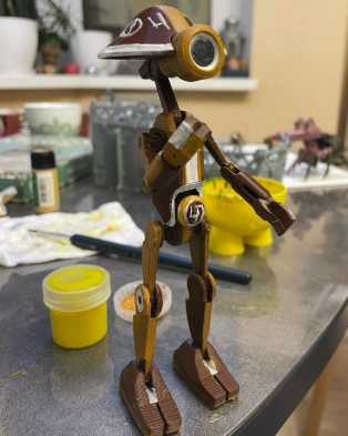 Перед вами великолепный ПИТ-дроид, который пополнил коллекцию совсем недавно. Модель сборная и подвижная, сгибаются, вертятся и отваливаются ноги и руки, голова кивает вперед назад. Инструкция - отдельный вид пытки, но результат понравился. Минусы: нет антенны на шляпке, не прочно держатся суставы, активные игры детей дроид не всегда переживает в цельном виде, чаще всего оказывается без рук и ног. С помощью акриловых красок дроид был покрашен в цвета ВАК-47 из "Войн клонов" 5 сезон 10-12 серии.