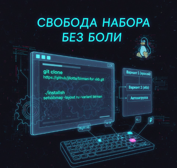 - Если принципиально нужна именно бирмановская карта клавиш (особенно редкие буквы типа ў, ѣ и т.д. в один клик) — ставь через git jilotta/birman-for-xkb