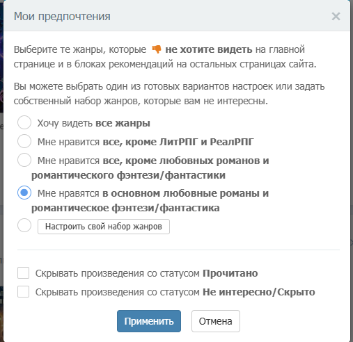 Я захожу на главную страницу, иду в раздел «Настроить мои предпочтения» и с замиранием сердца ставлю заветную галочку напротив пункта «РОМАНТИКА» (мне нравятся в основном любовные романы и романтическое фэнтези/фантастика).