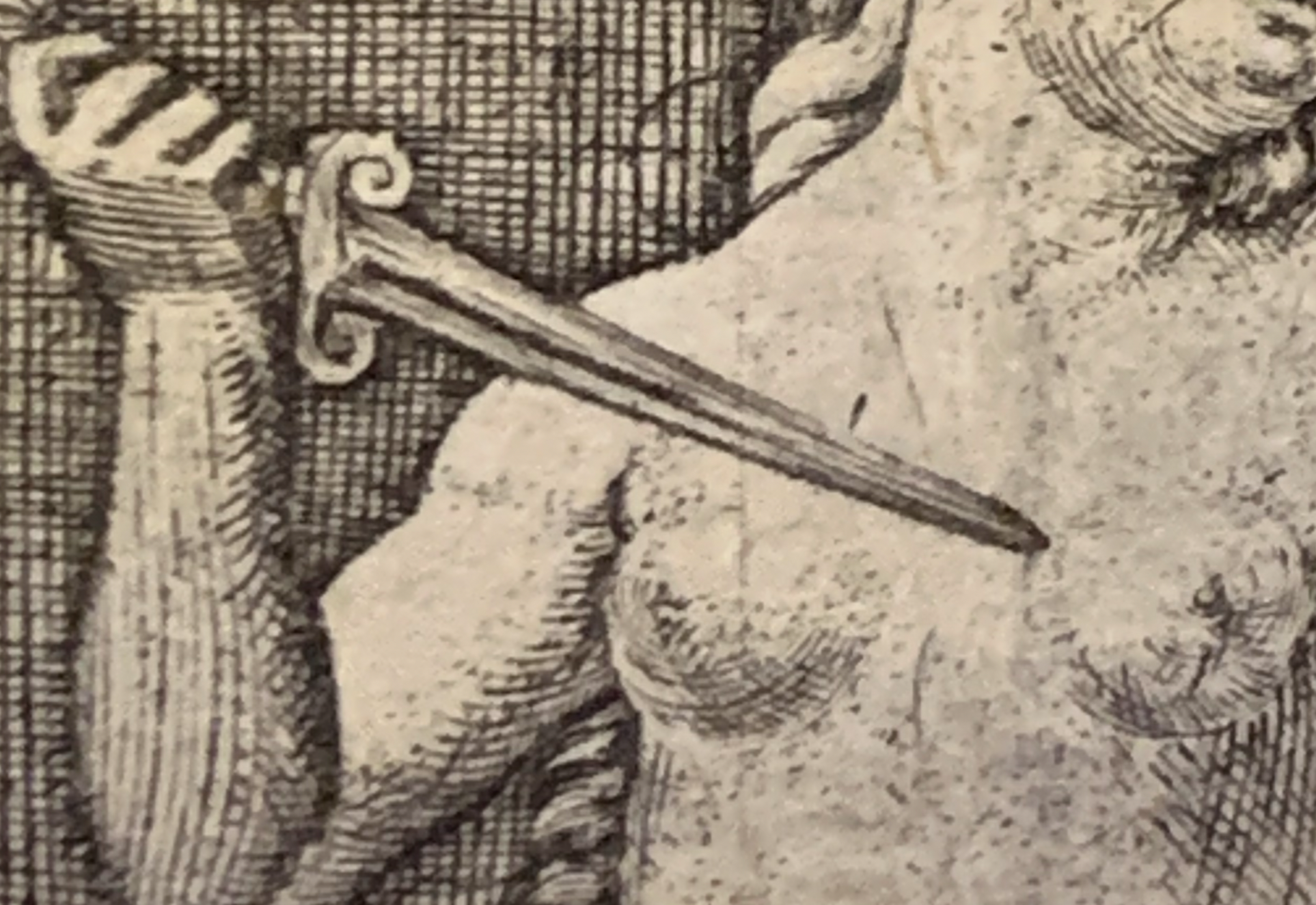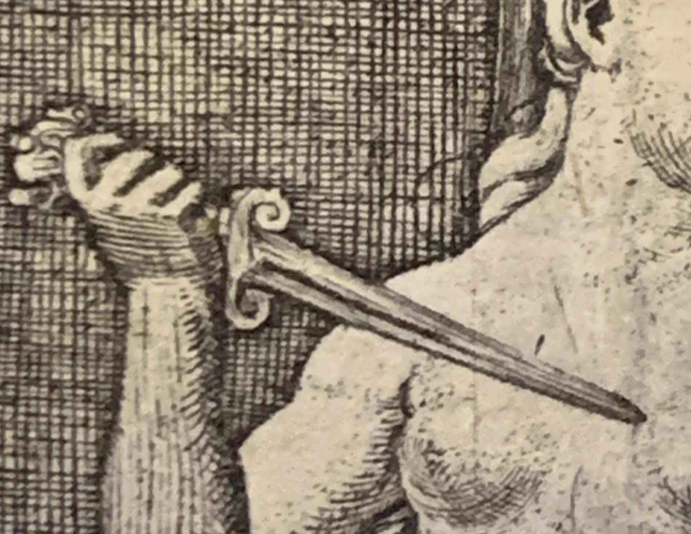Металл кинжала на этой гравюре передан с помощью виртуозной игры контрастов, что крайне сложно сделать в технике резцовой гравюры.