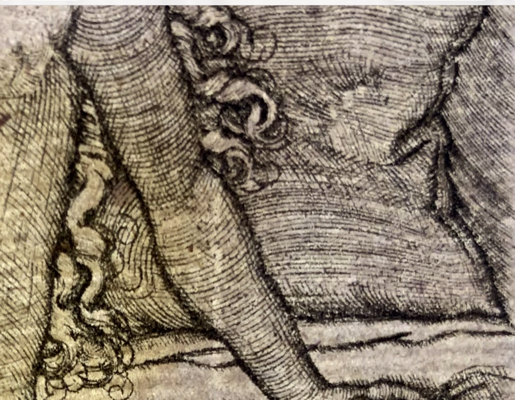Еще один оптический эффект -это эффект дымки, «сфумато», о которой я уже писала. Эту технику Пенц перенял у итальянских мастеров. Он влзникает из-за того, что штрихи расположены очень близко друг к другу, гравюра не кажется «полосатой».