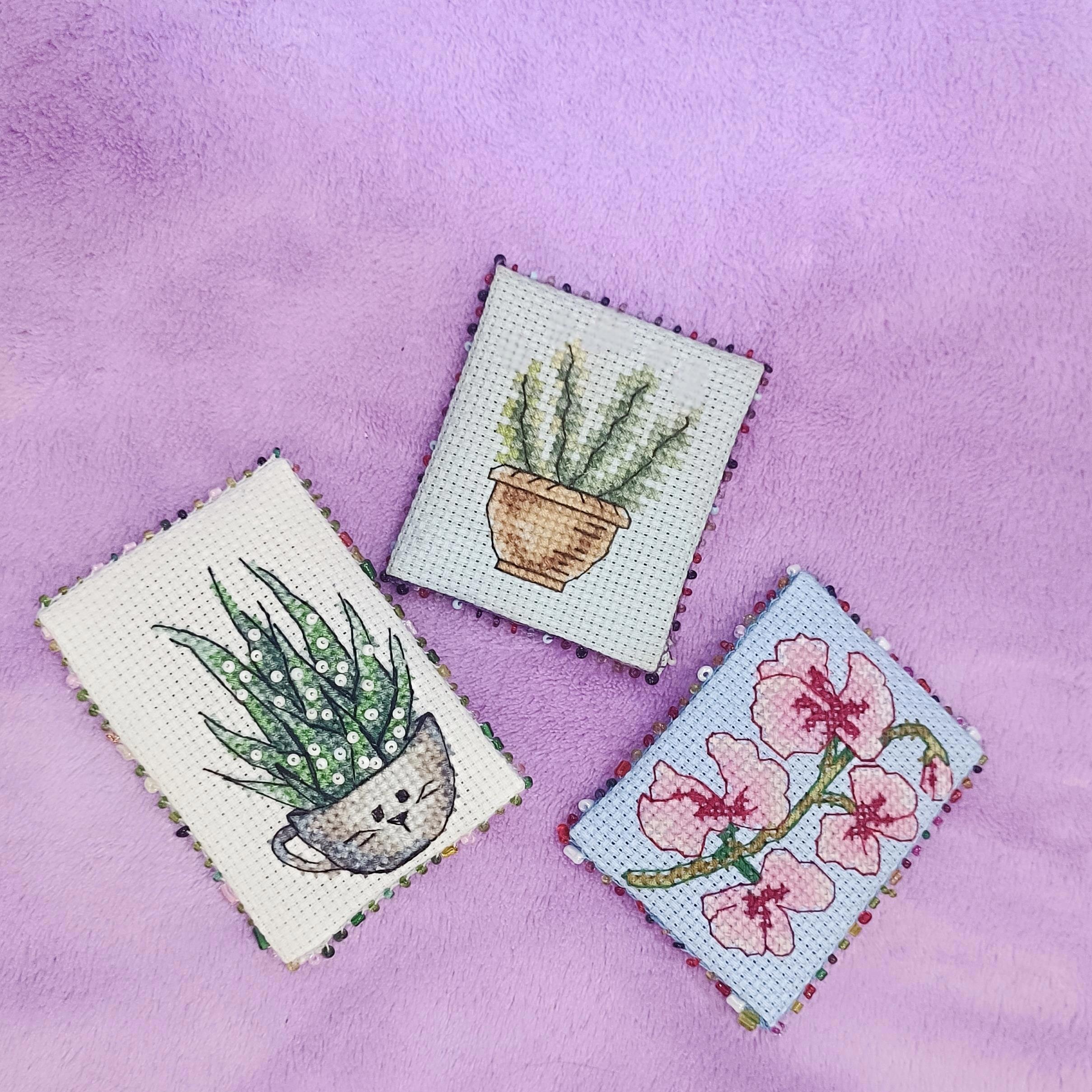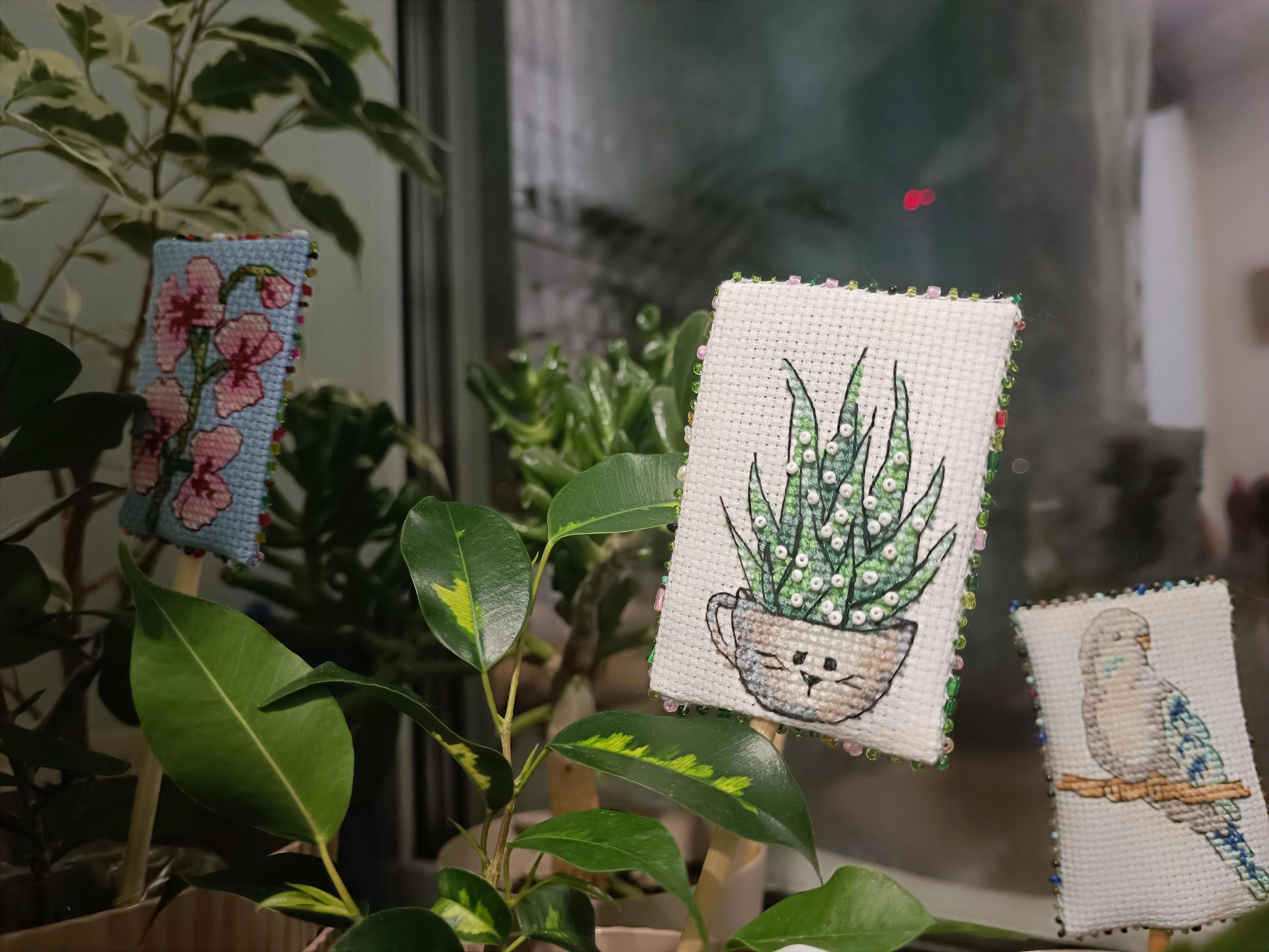 Это не просто вышитые картинки для украшения. Палочками от роллов, на которые эти картинки надеты, я рыхлю грунт в цветочных горшках.