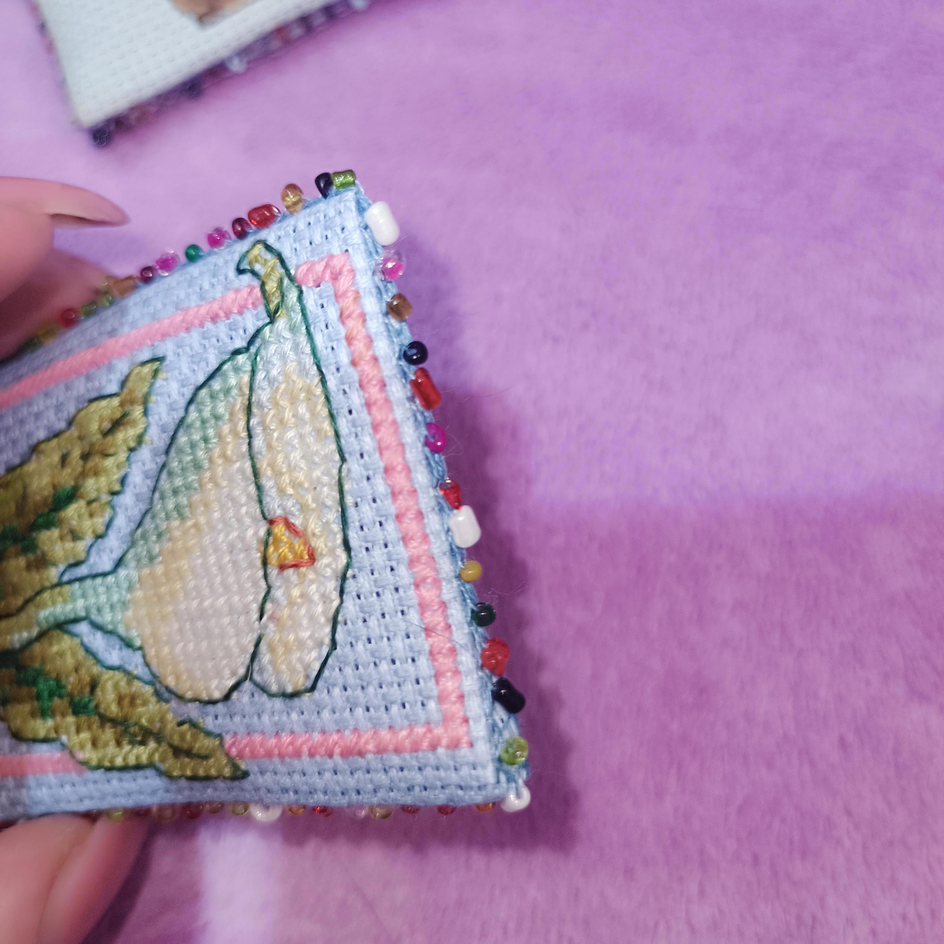 Но я сейчас даже не о самих картинках, а о бисере. Часто после того, как вышиваешь что-то бисером, остаётся некоторое количество некондиционных бисеринок. Мне так жалко их выбрасывать. Они кривенькие, косенькие, либо наоборот слишком крупные, сдвоенные, вытянутые. То есть для картины, где зашивка бисером идёт сплошняком, уже не подходят. И вот у меня копится, копится целый контейнер таких.