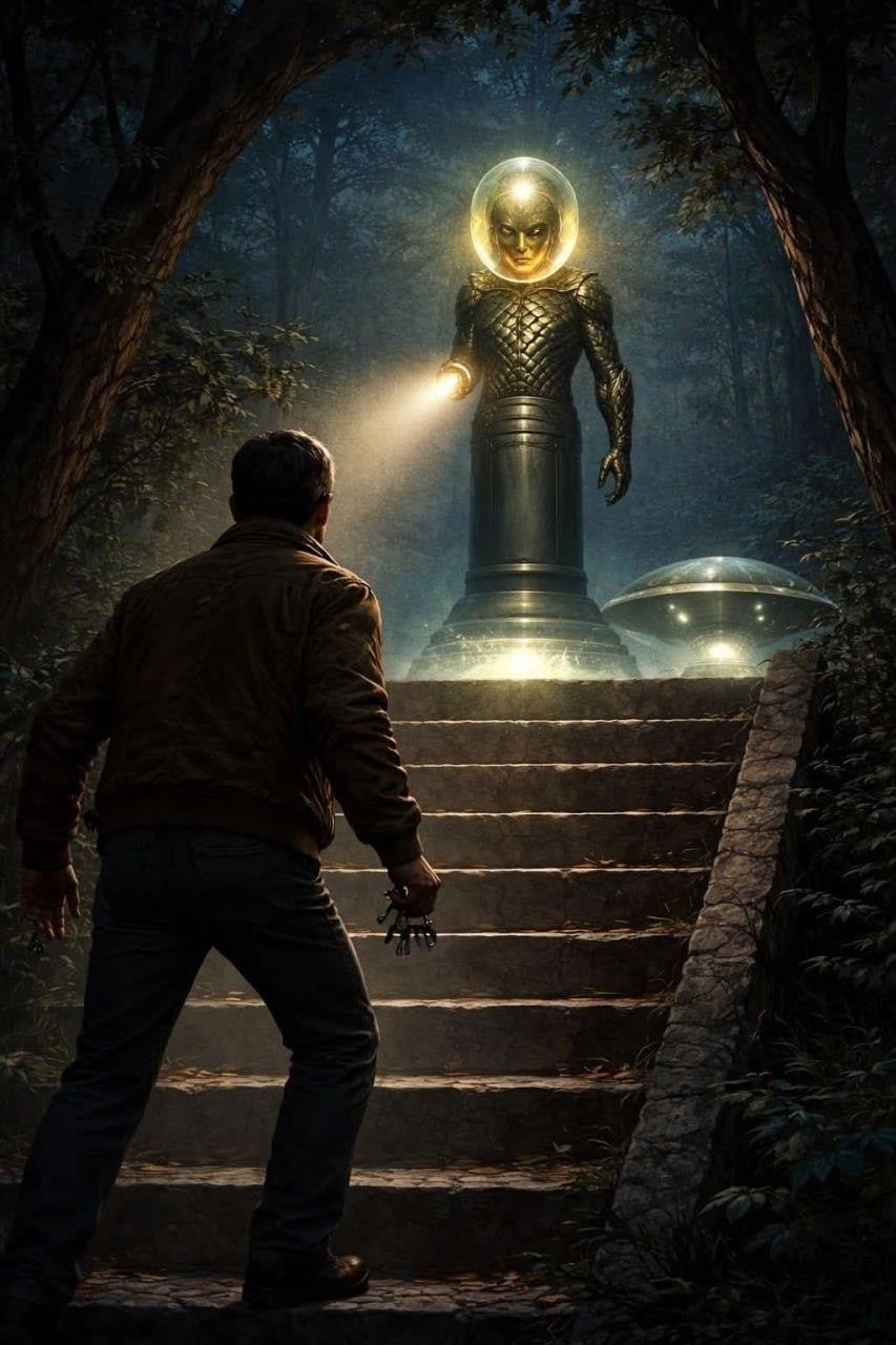 Преодолев сильный шок и растерянность и следуя естественному порыву приблизиться, Ренцо начал подниматься по лестнице к существу. Однако уже через несколько секунд его опасения подтвердились: существо резко повернуло верхнюю часть тела к нему механическим, роботоподобным движением, а голова повернулась чуть позже, что создавало впечатление механического управления. В правой руке оно держало устройство, похожее на фонарь, с чем-то вроде лампы внутри, излучающей слабый свет. Существо направило этот свет прямо на Ренцо, и тот мгновенно оцепенел.