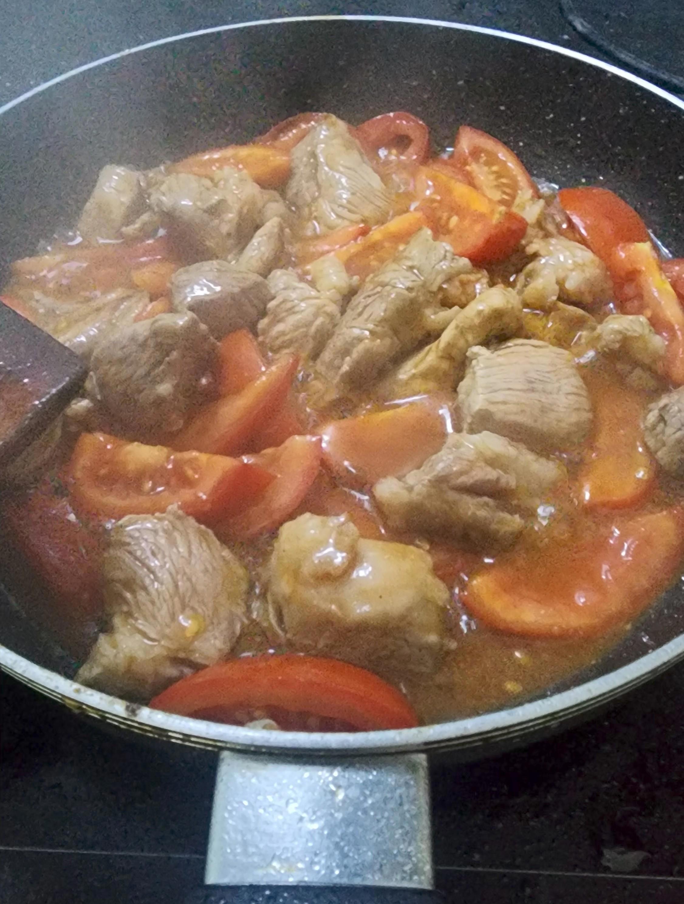 Затем помидорки. Жарим пока сок не станет густым (для этого без устричного соуса не обойтись!