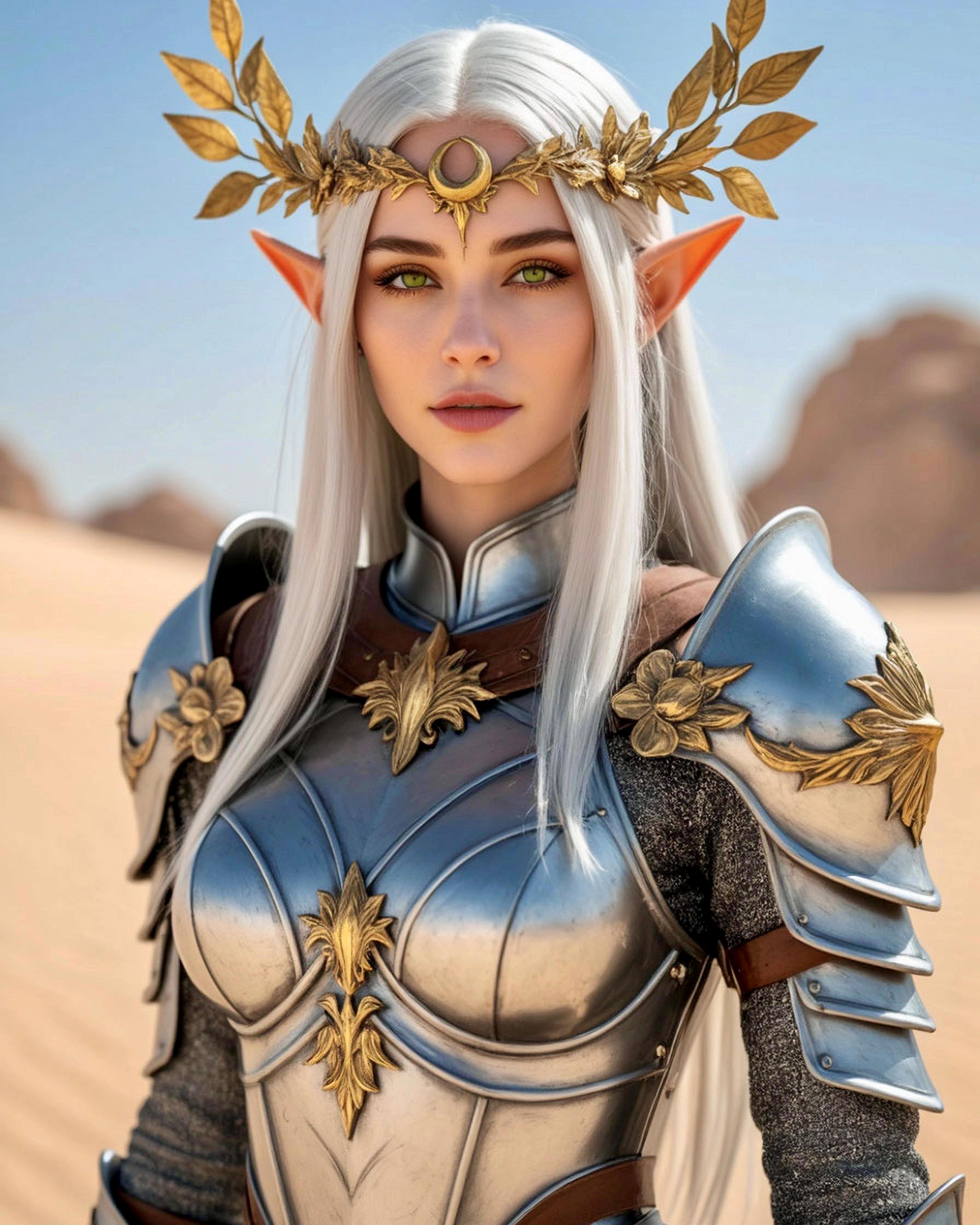 Эльфийка обернулась на воина и тот потерял дар речи, встав столбом. На него внимательно смотрела невероятной красоты девушка. Длинные серебристые волосы водопадами ниспадали на изящной работы сверкающие латы с золотыми узорами, а большие зеленые глаза завораживали насыщенным цветом и напоминали изумрудную гладь озера, бархатное мховое покрывало или глубокий омут лесной чащи, скрывающий многовековую мудрость и нетронутую красоту природы.