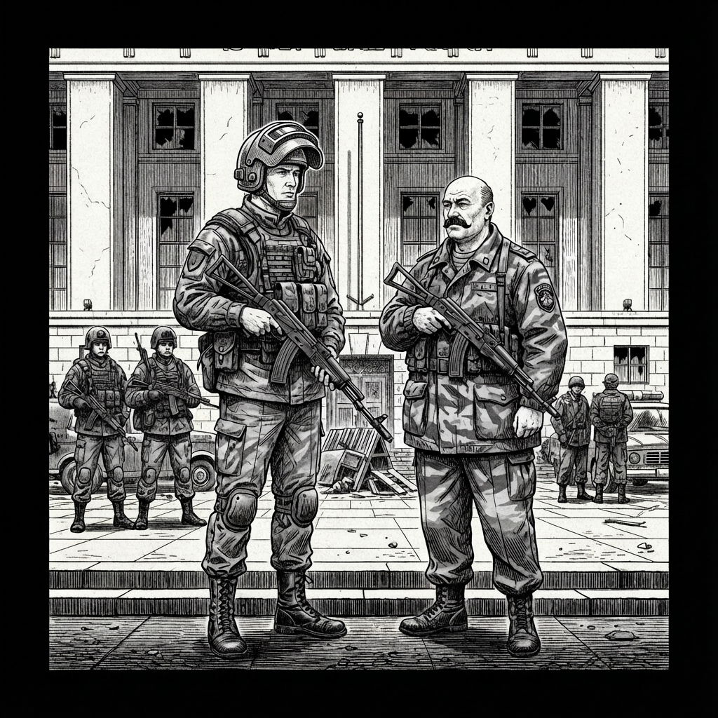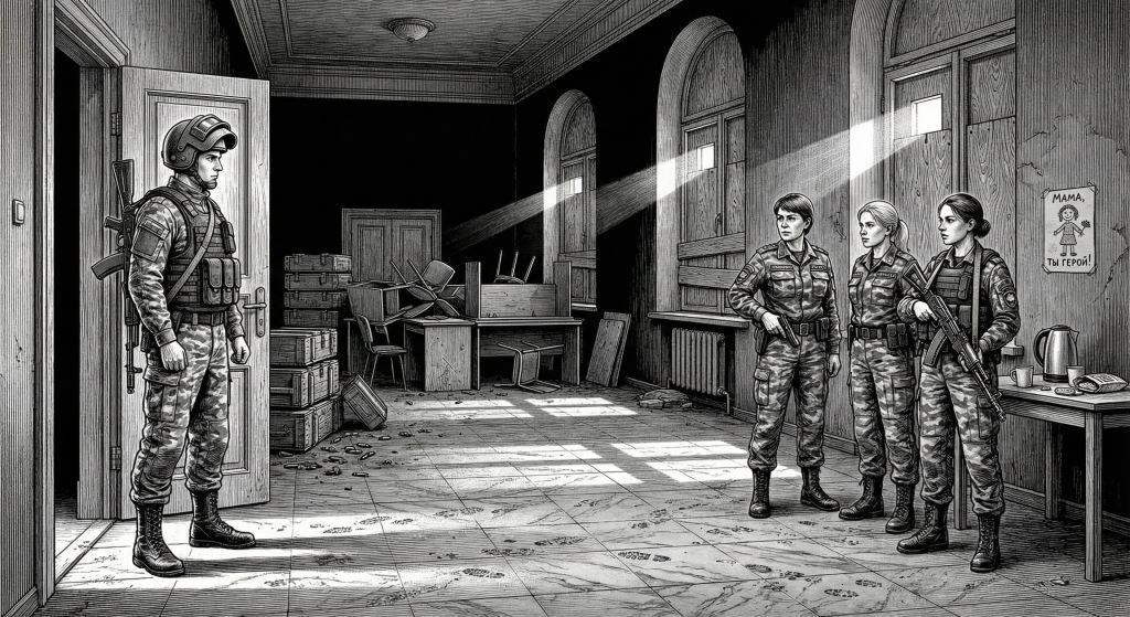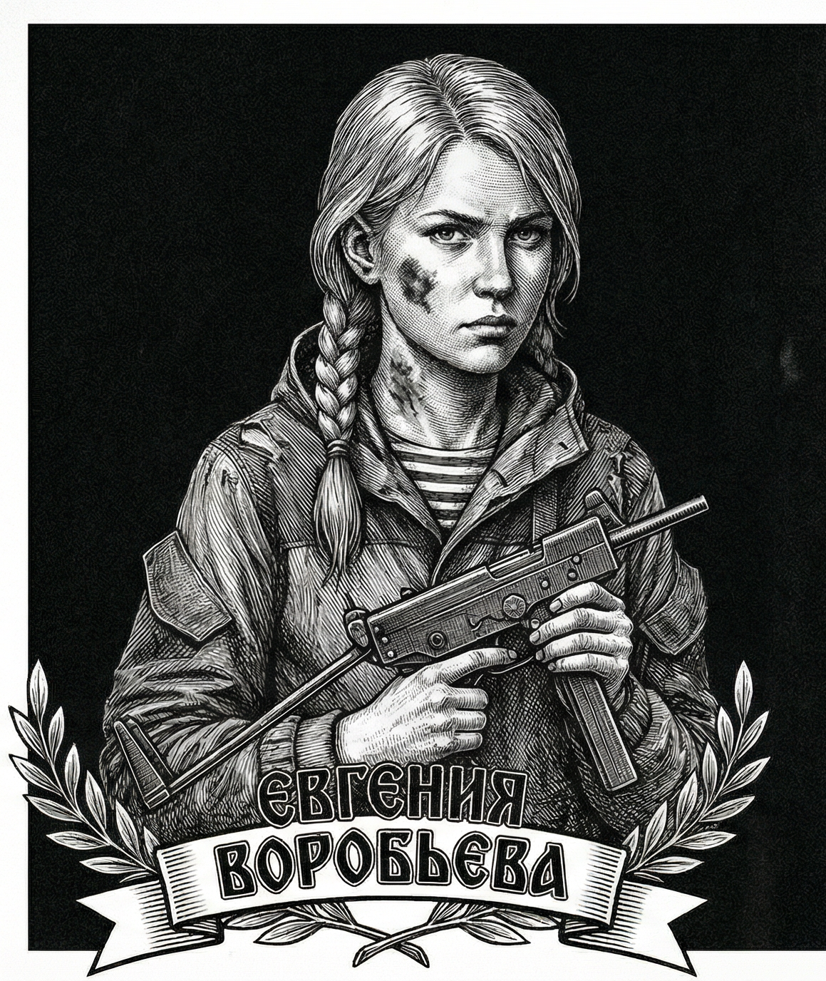 1. Снова Женька Воробьёва. Боевая и с "Кедром". Откуда рамочка с виньетками и буквы с закосом под старославянский шрифт - не спрашивайте, я понятия не имею. Сомневаюсь, что в промте Дмитрий всё это прописал. Скорее - снова ИИ самодеятельностью занимается.