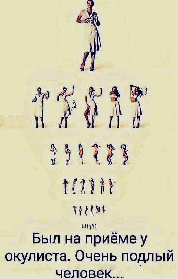 Окулист - пациенту:. - Закрывайте левый глаз… какая первая буква в нижней строчке?. - Б.. - Посмотрите внимательнее.. - Б.. - Открывайте левый глаз… так какая буква?. - Я же вам уже два раза сказал - Б!. Окулист подходит к доске, смотрит и говорит: - Вот черт, это и правда Б!