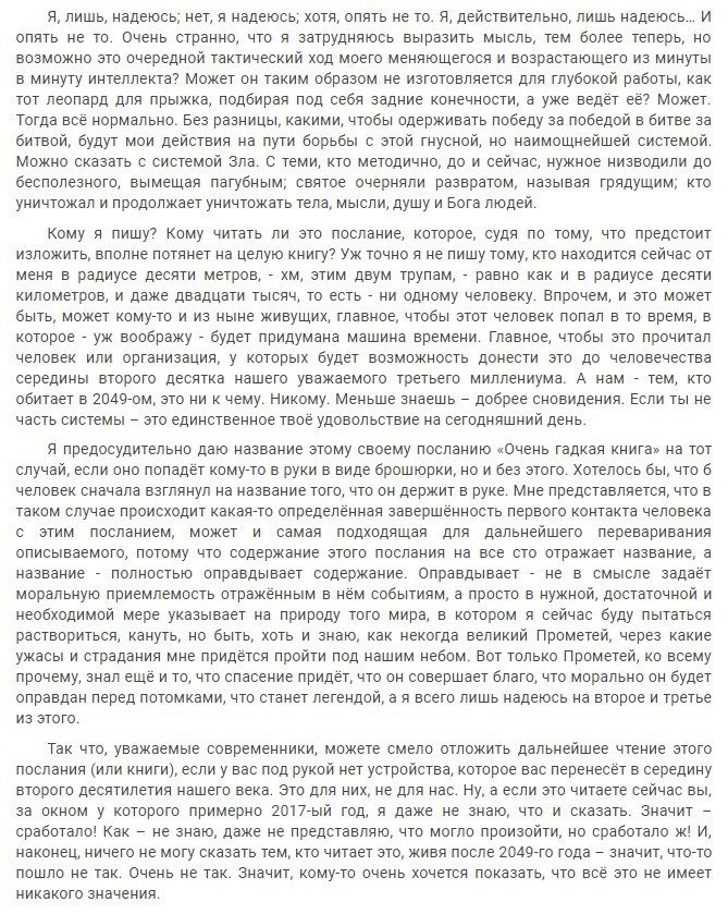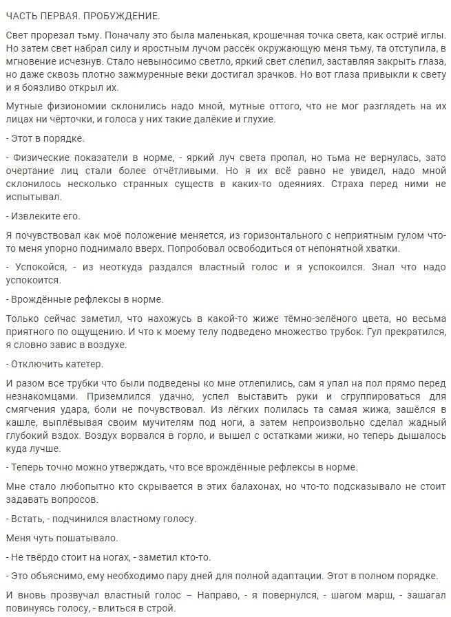 Нет, может быть, безымянному до сих пор герою так и положено вести себя, раз он всё ещё просто "ОН"... Но как-то меня безымянные герои не особо привлекают, хоть у них и тренированное тело и разум. Уж больно они какие-то деревянные. Да и история о похищении ГГ инопланетянами (ведь это об этом?) банальна. Уж сколько я таких историй читал-перечитал...